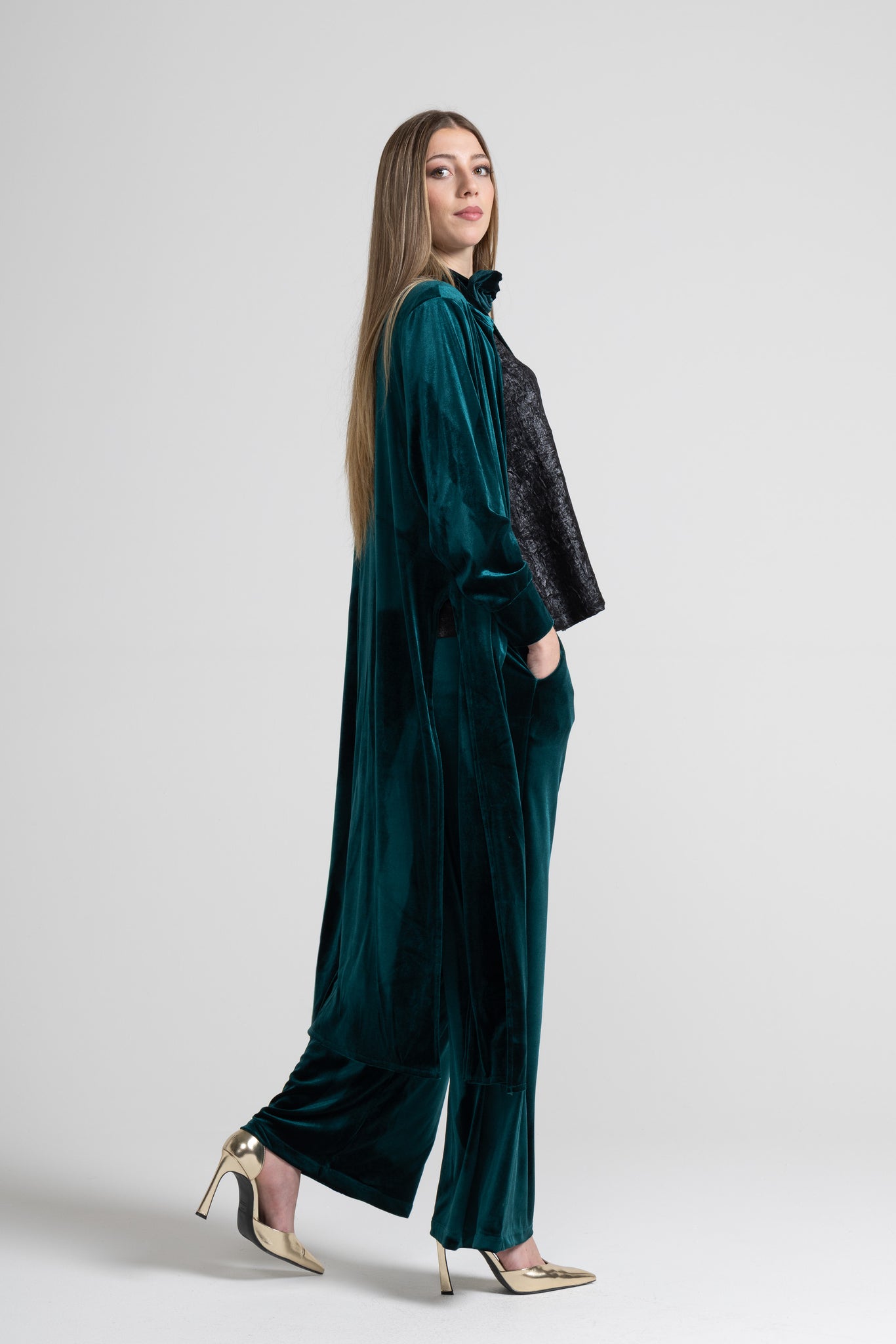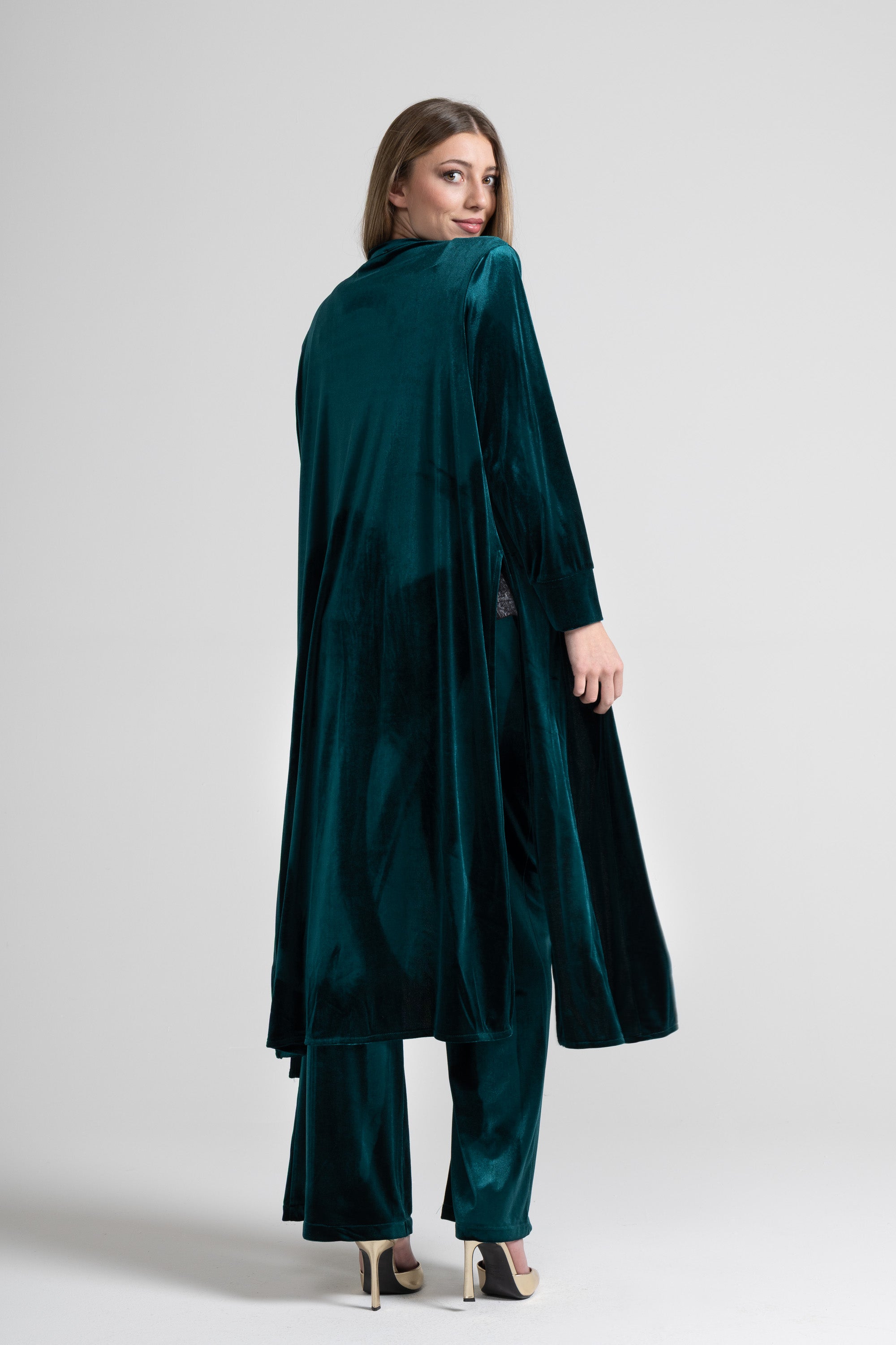 Soprabito lungo in morbido tessuto di velluto, raffinato e versatile, un modello elegante ma disinvolto, ideale per impreziosire qualsiasi outfit con un tocco di sofisticata luminosità.
