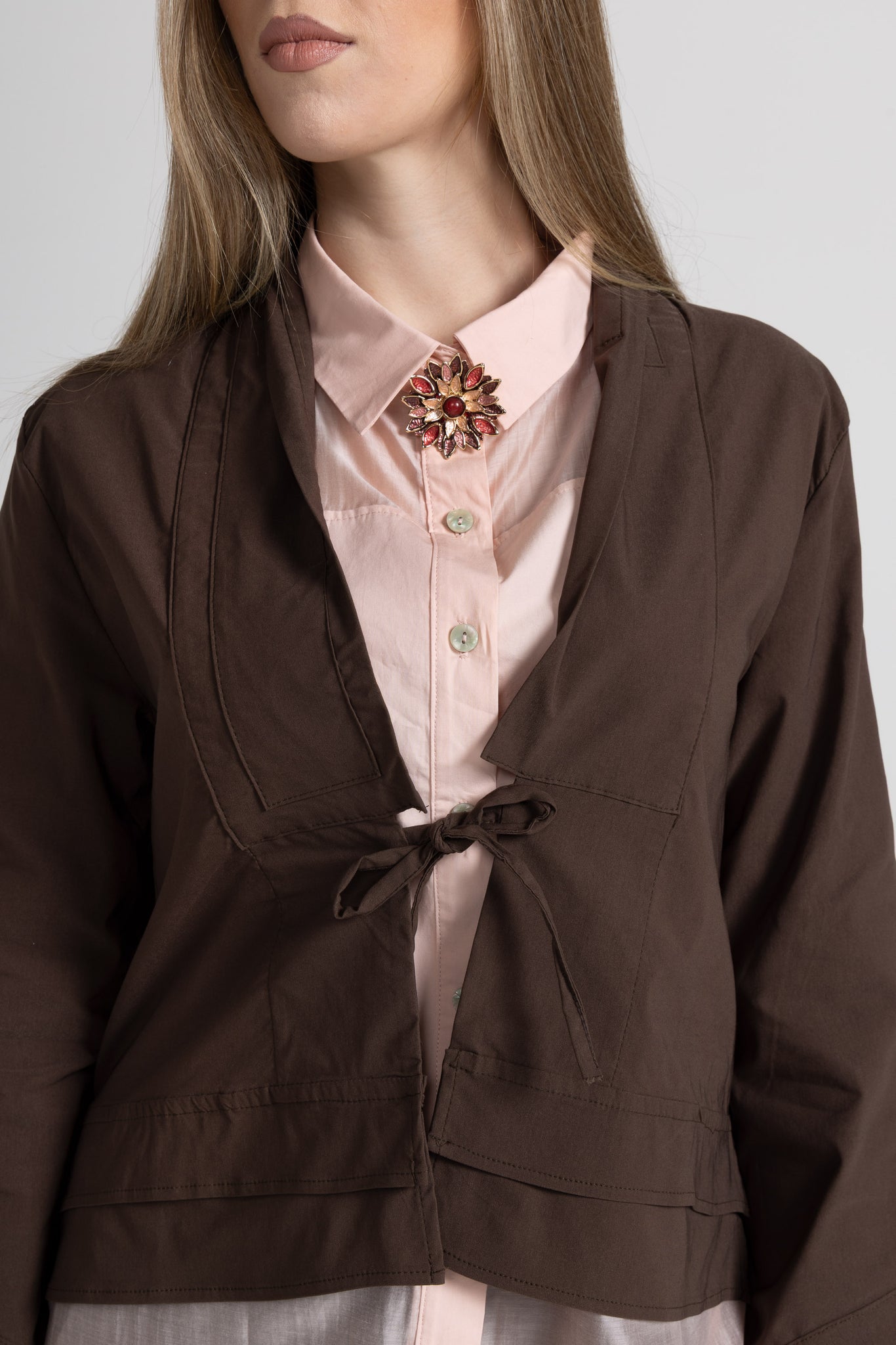 Giacca corta in tessuto di viscosa, scollo a V con rever e dettaglio impunture, chiusura frontale con coulisse tono su tono, manica lunga con orlo ribattuto alto, fondo con orlo ribattuto alto. Linea ampia