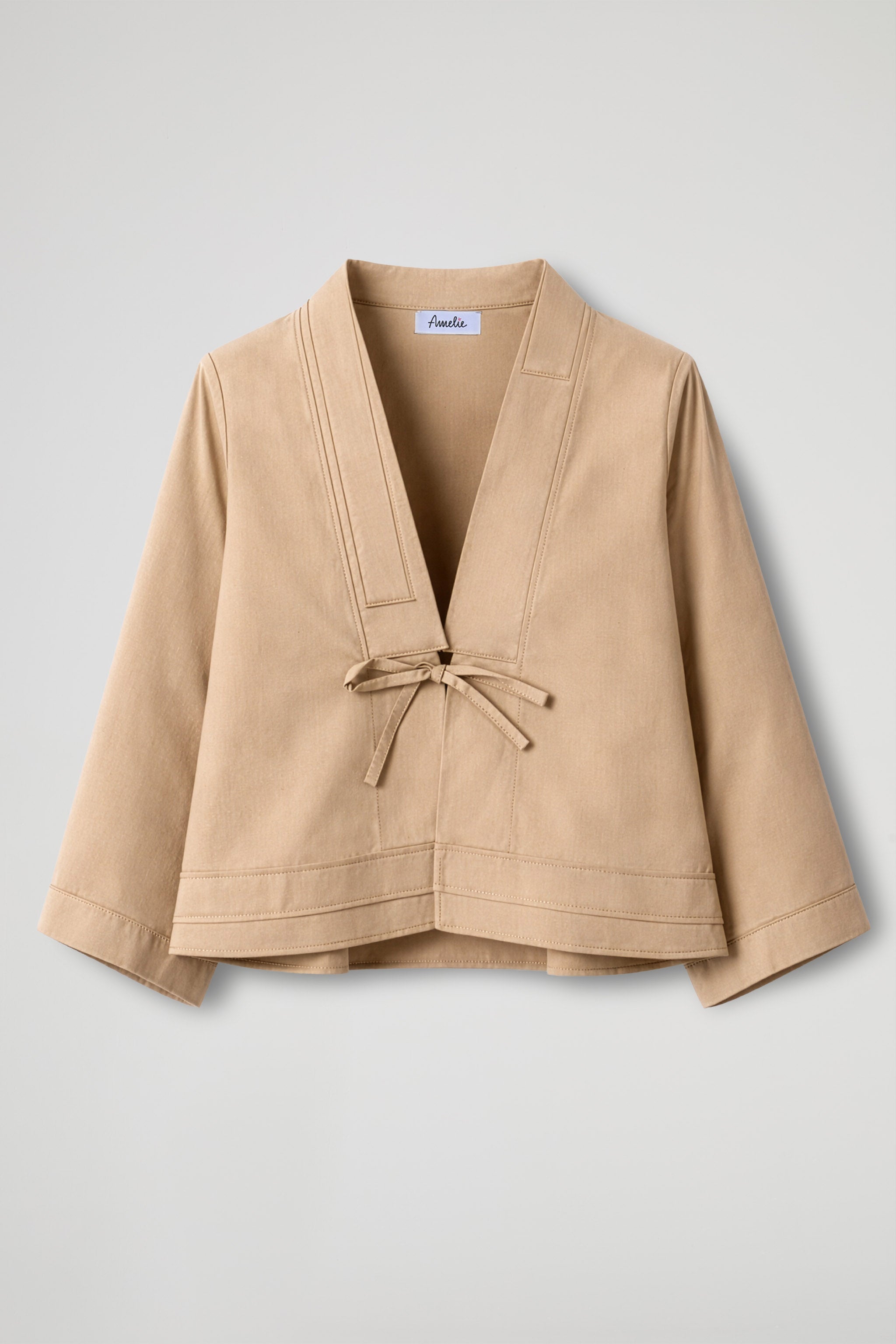 Giacca corta dal taglio pulito e moderno, veste con leggerezza e definisce la silhouette grazie alla chiusura con laccetti sul davanti. Lo scollo a V con rever essenziale slancia il décolleté, mentre le maniche ampie aggiungono un twist contemporaneo e super chic.