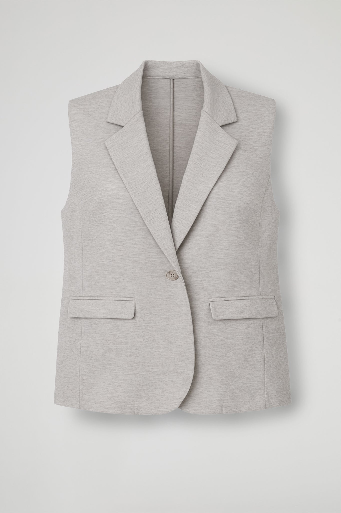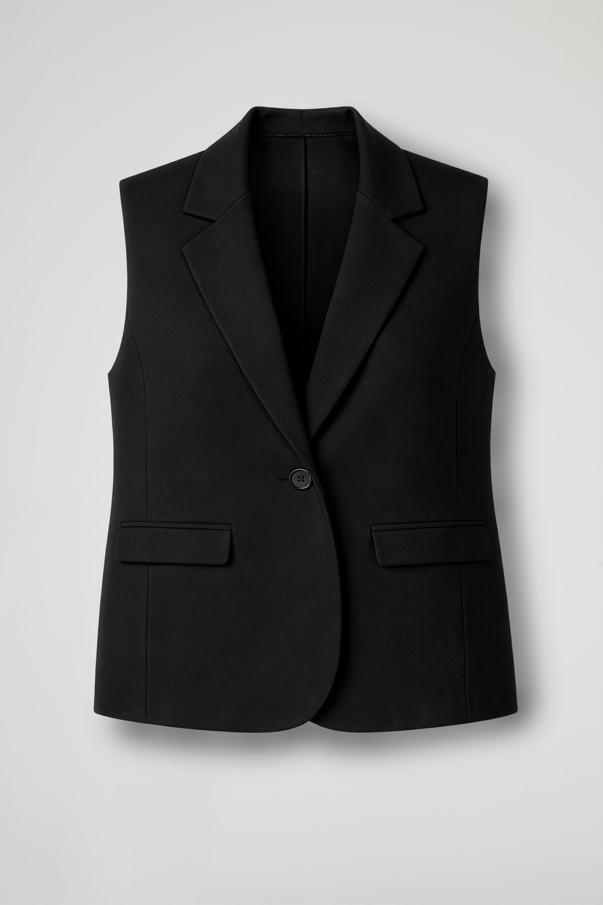 Gilet smanicato dal taglio deciso e contemporaneo, perfetto per dare carattere anche al look più essenziale. Il modello presenta rever classico, chiusura con un bottone effetto marmo e una linea pulita che scivola sul corpo con vestibilità morbida. Sul davanti, le tasche con pattina richiamano la sartorialità del blazer tradizionale, mentre lo spacco e l'arrotondamento sul fondo addolcisce la silhouette e rende il capo facile da stratificare.