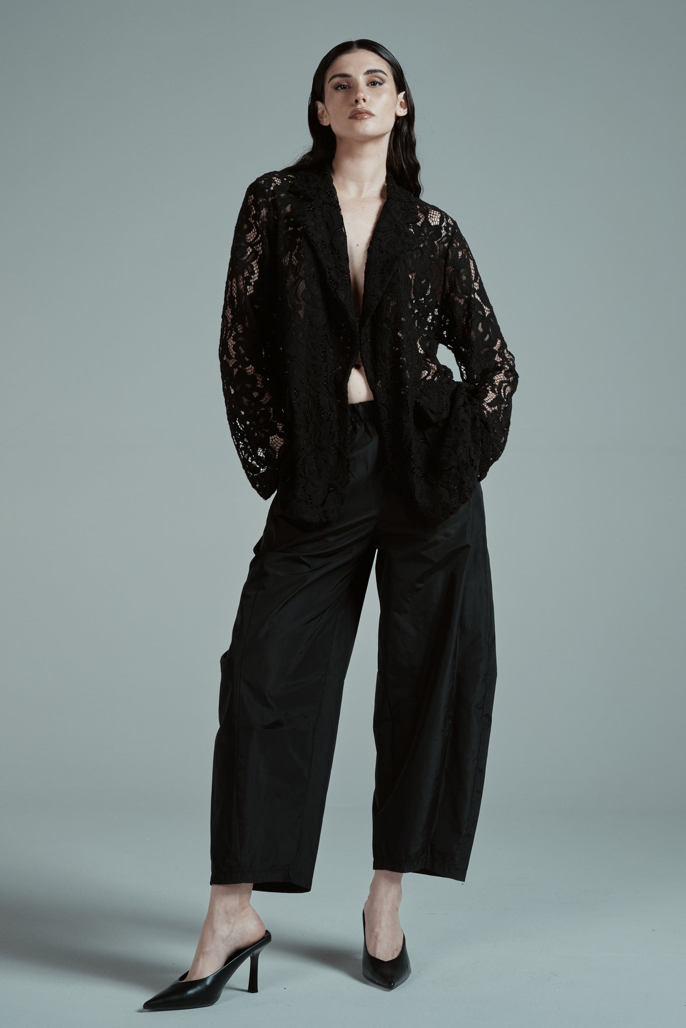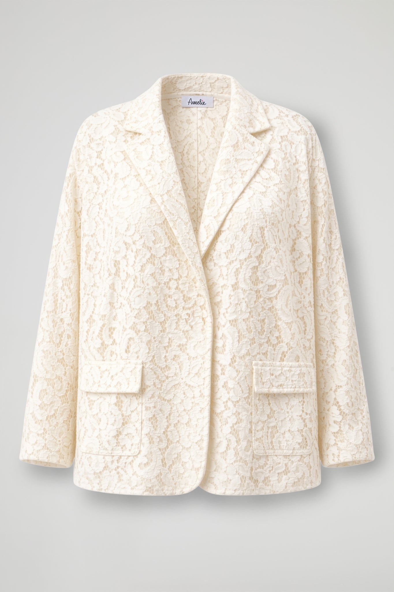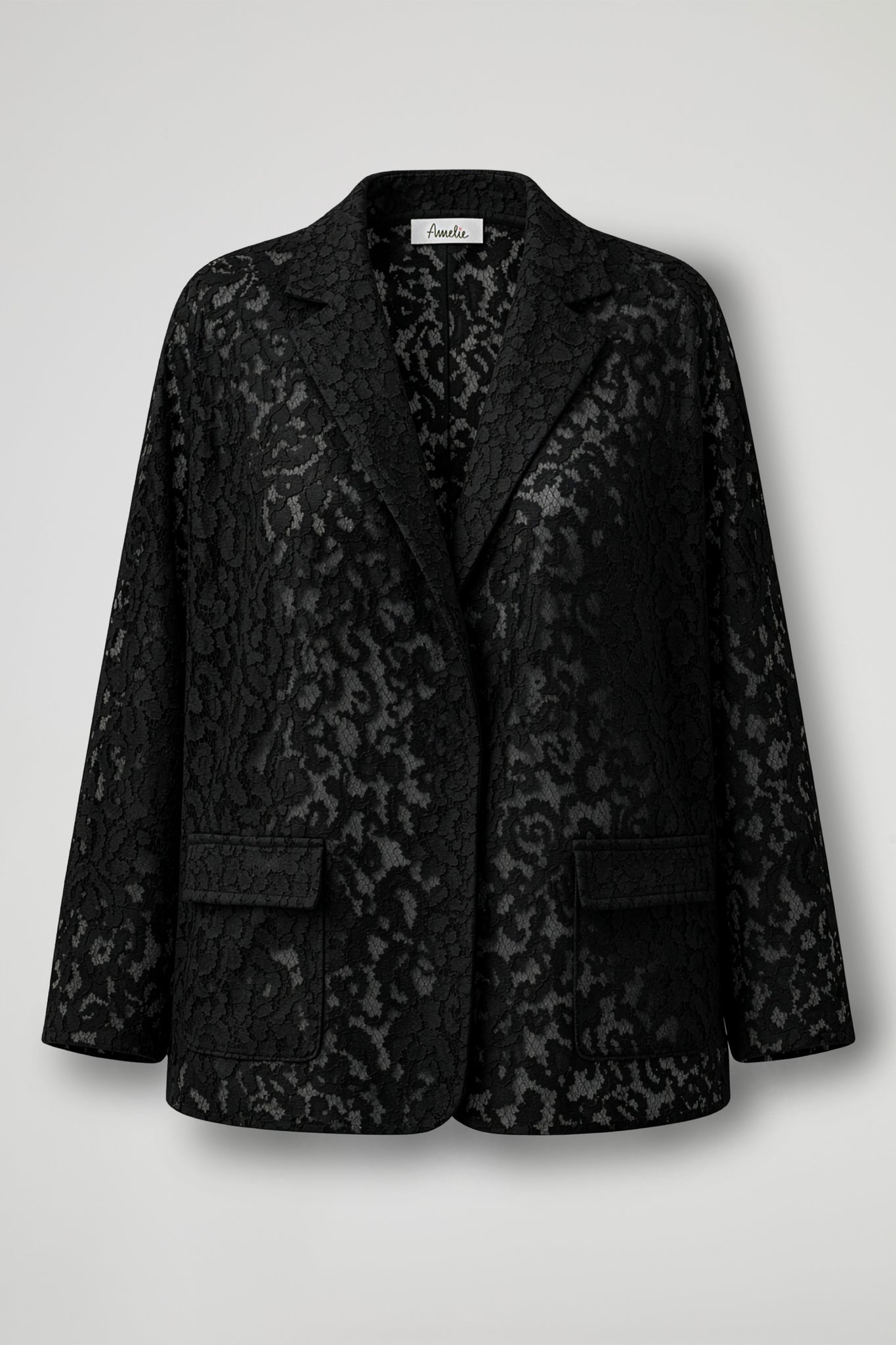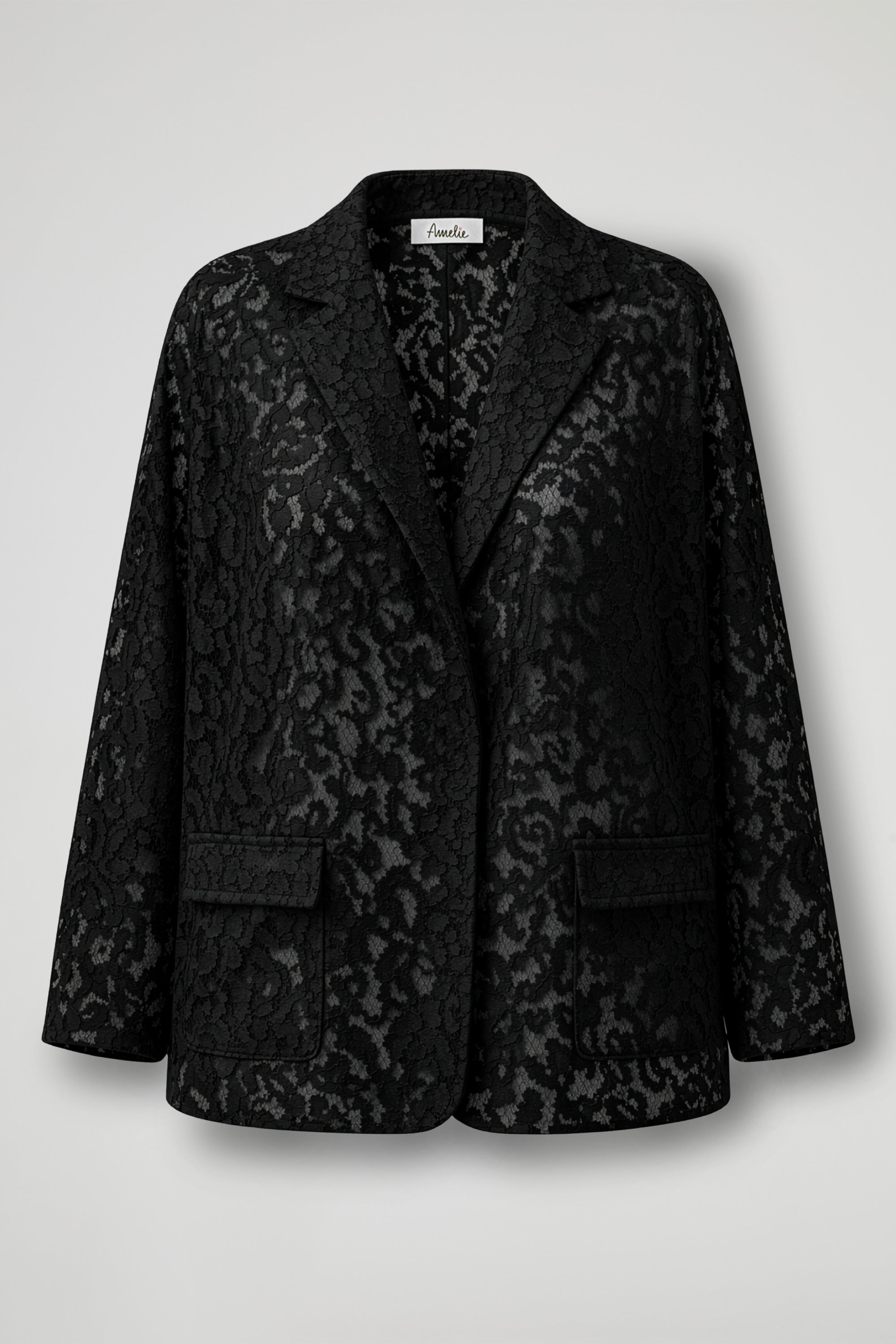 Blazer in elegante pizzo, dal design raffinato e femminile. Presenta un taglio morbido con rever classico e chiusura frontale minimal, per un look pulito e sofisticato. Il tessuto lavorato a motivo floreale dona texture e leggerezza al capo, rendendolo ideale anche per occasioni speciali. Completano il modello le tasche applicate sul davanti e le maniche dalla linea comoda. Perfetta da abbinare sia a outfit eleganti che a look più casual per un tocco chic.