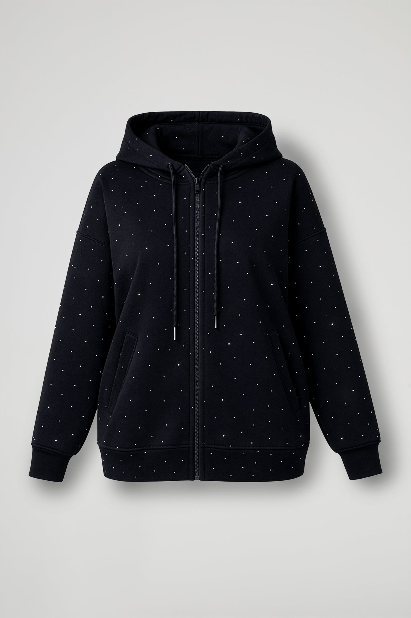 Felpa Over dal design essenziale e versatile illuminata da piccoli micro strass. Modello con cappuccio regolabile con laccetti, chiusura frontale con zip e tasche laterali comode. Vestibilità confortevole, ideale per look casual e sportivi, perfetta da indossare tutti i giorni. Linea ampia