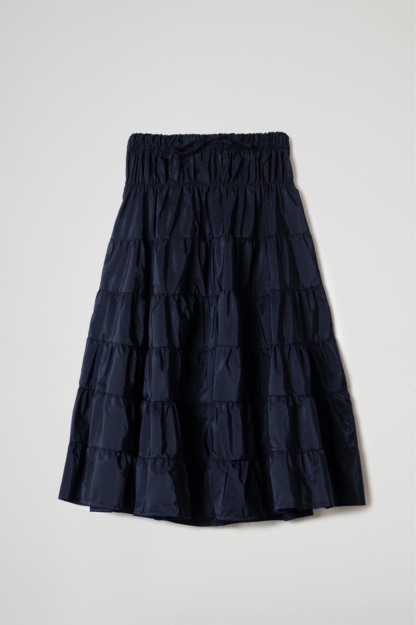 Gonna lunga a trapezio in tessuto taffetà effetto nacrè, coulisse regolabile in vita, tasche a filo, balze orizzontali arricciate. Linea ampia e morbida.