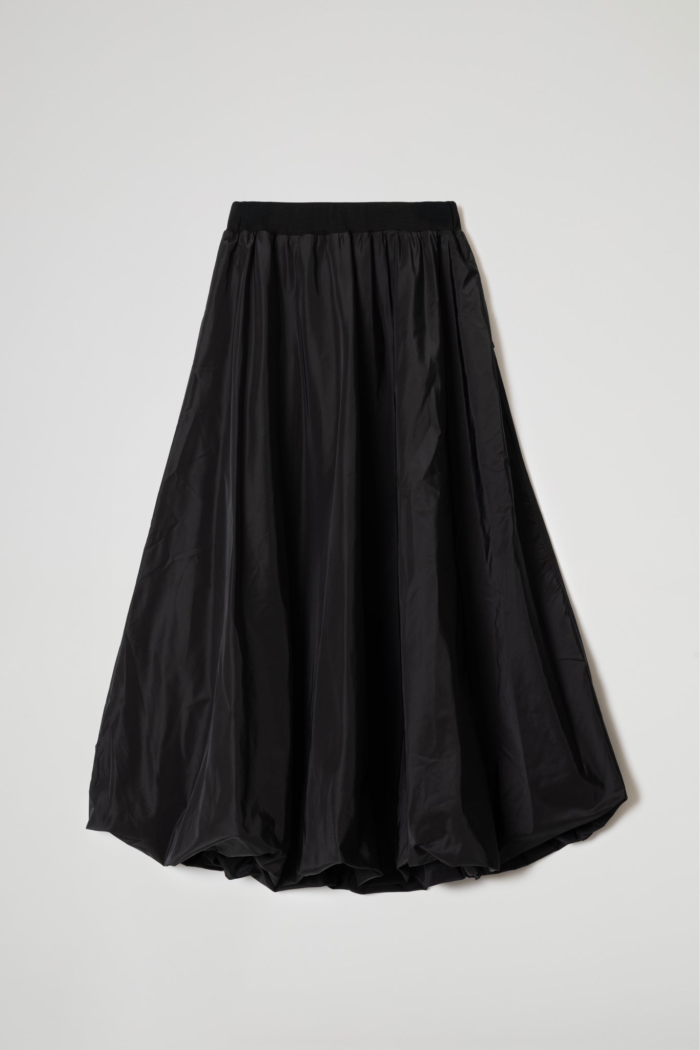 Gonna lunga in tessuto tafettà effetto nacrè, fascia elastica a coste in vita, linea ampia con fondo arrotondato.
