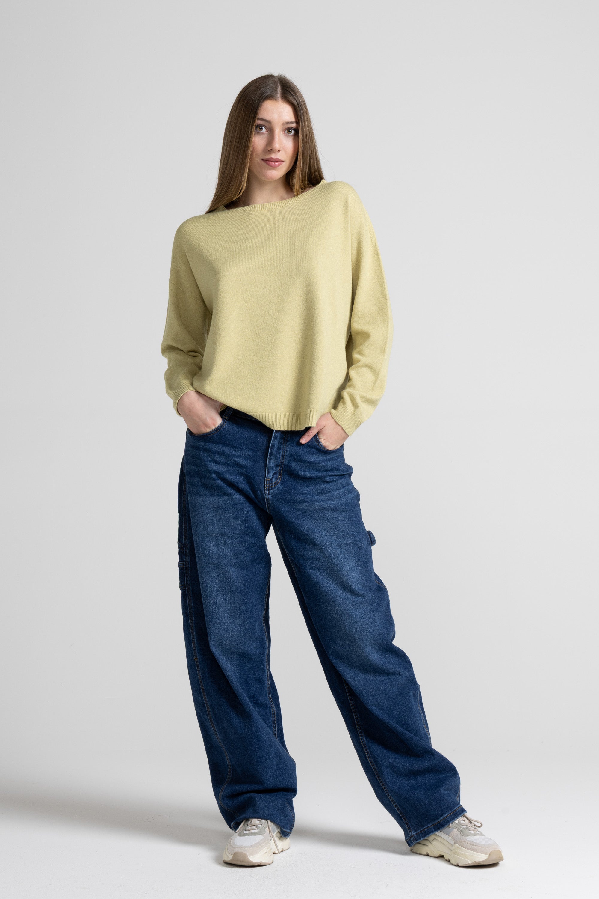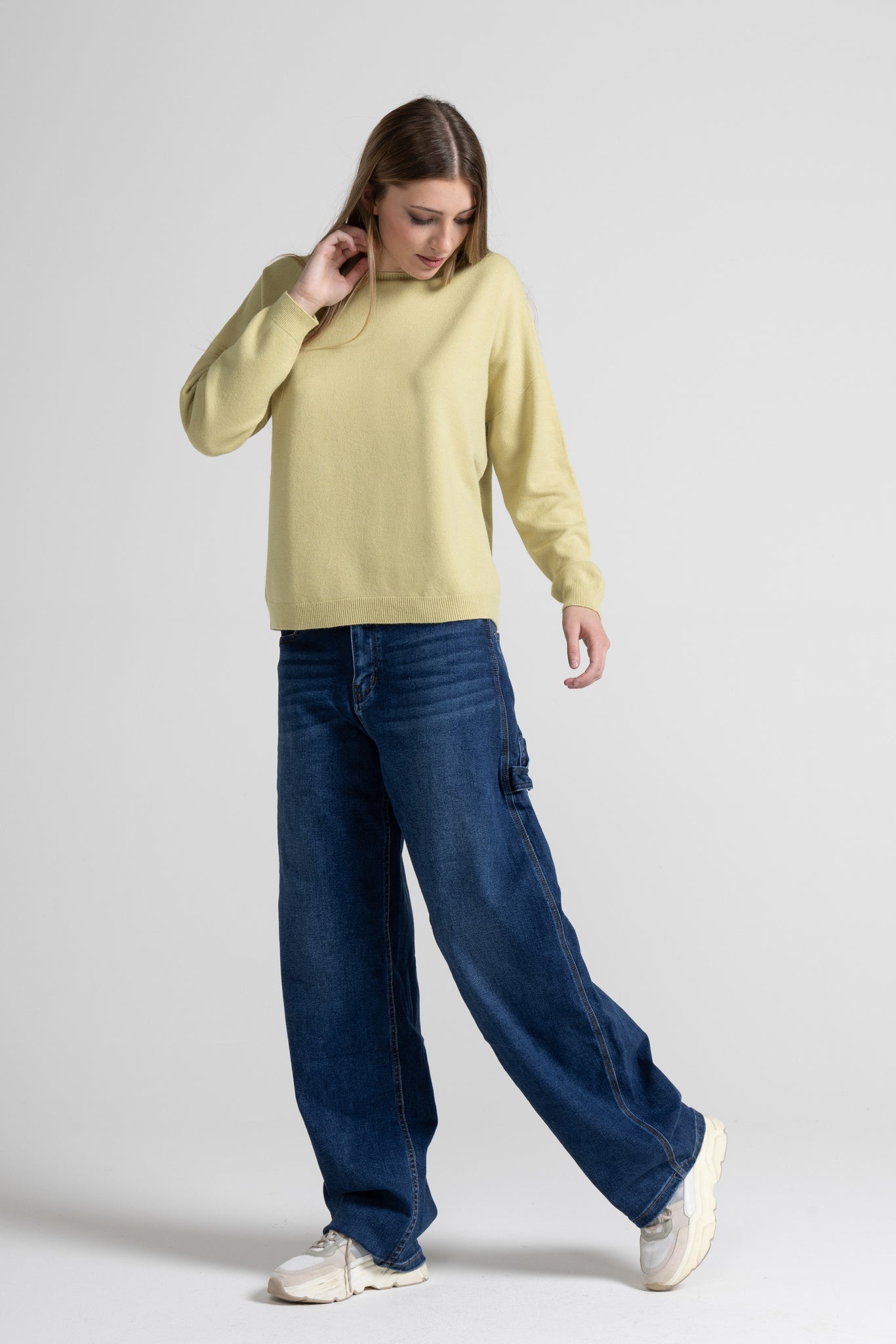 Jeans dal taglio leggermente baggy, lavaggio sfumato effetto vissuto, vita alta, chiusura frontale con bottone e zip, 5 tasche, gamba ampia e morbida, dettaglio cargo sul lato con pattina applicata, impunture a contrasto.