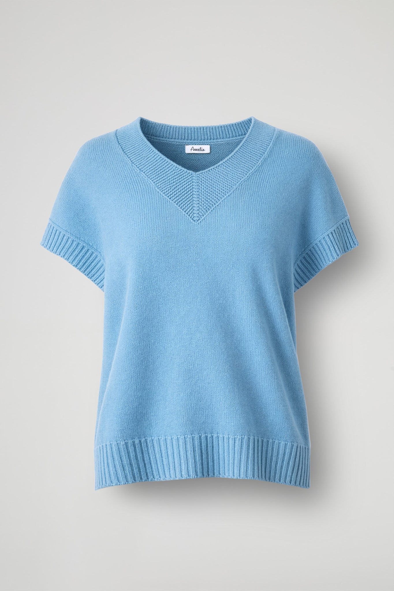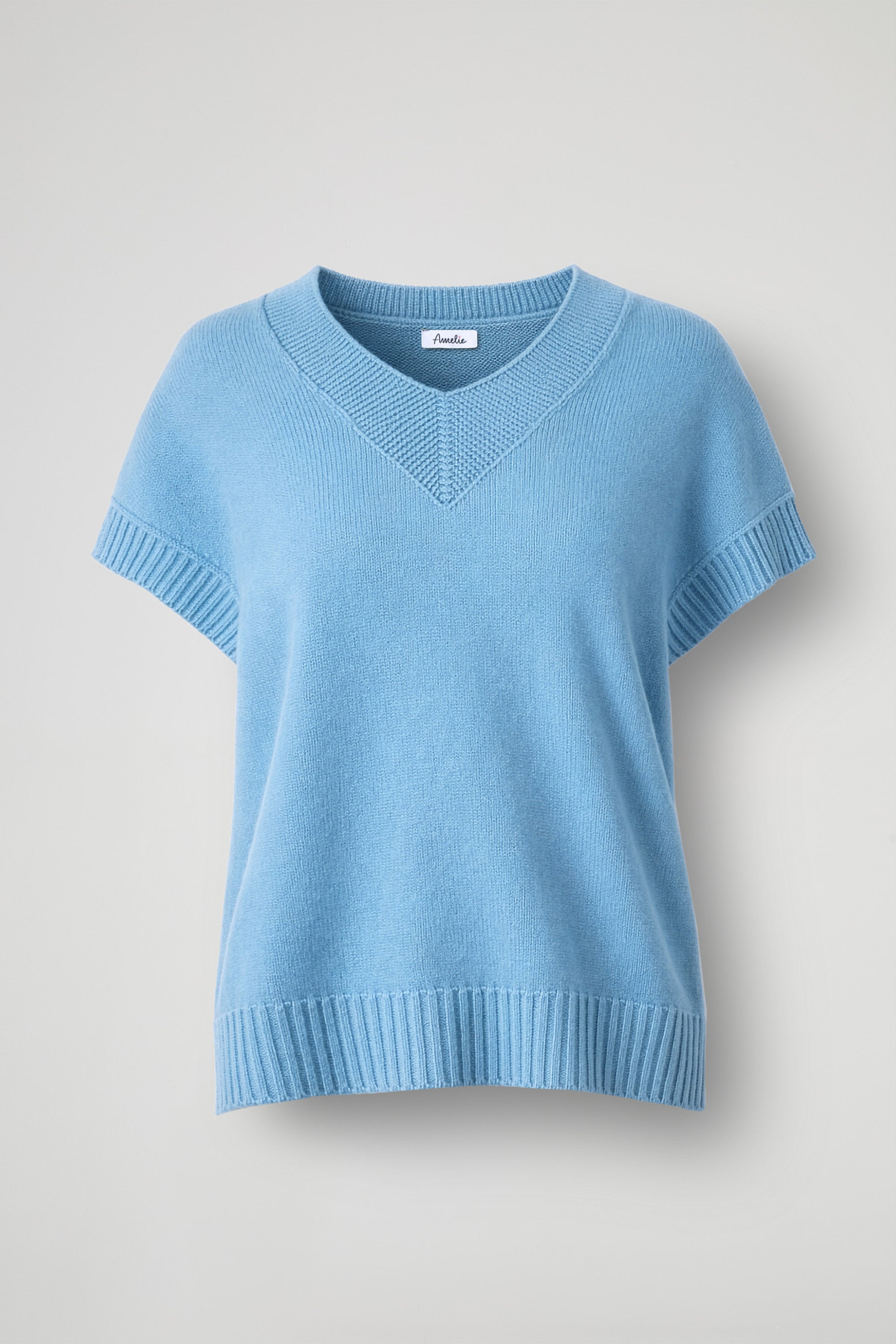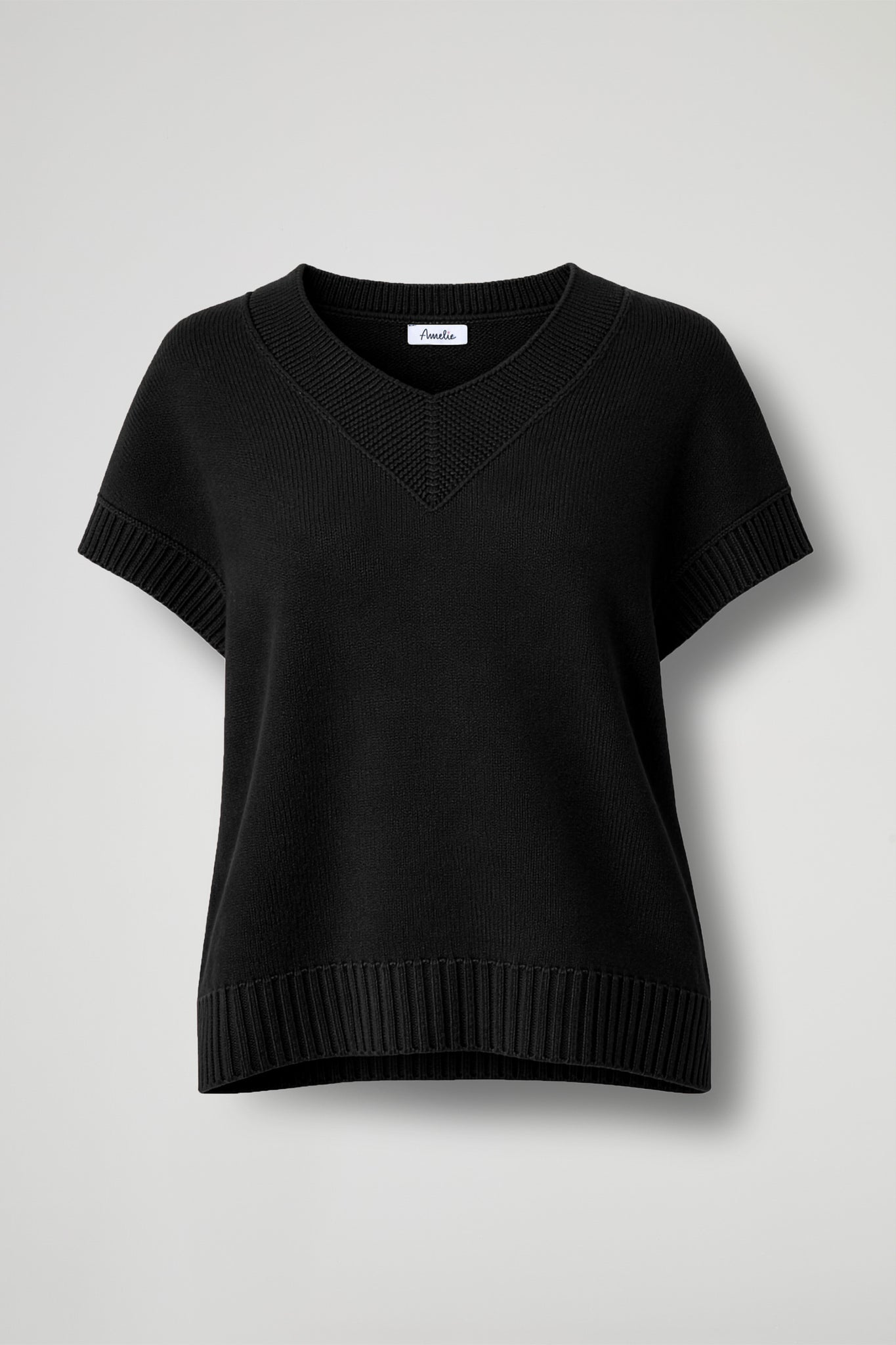 Smanicato scollo a V con inserto lavorato in rilievo, spalla scesa con dettaglio a coste, orlo alto su fondo con dettaglio a coste.