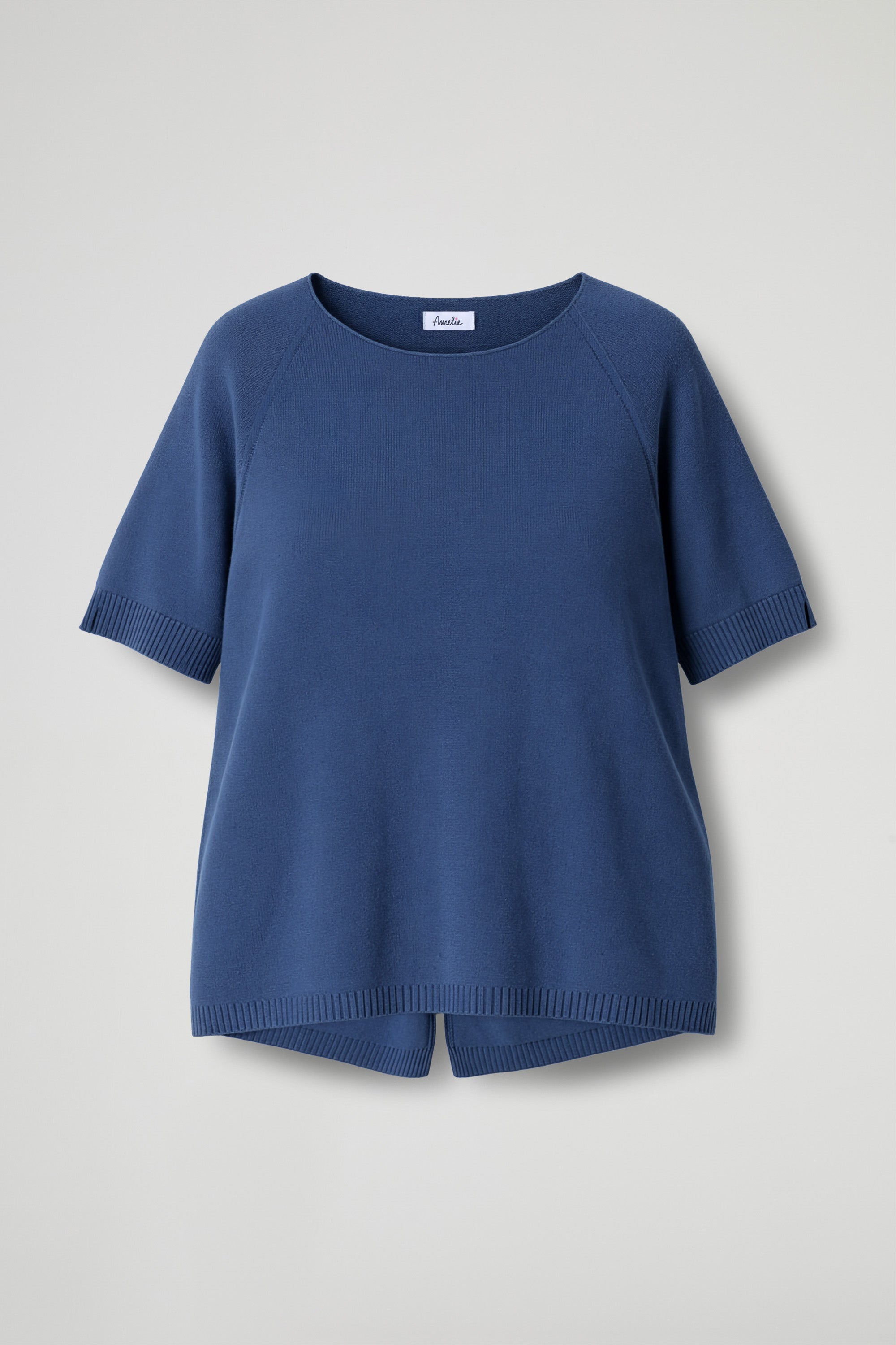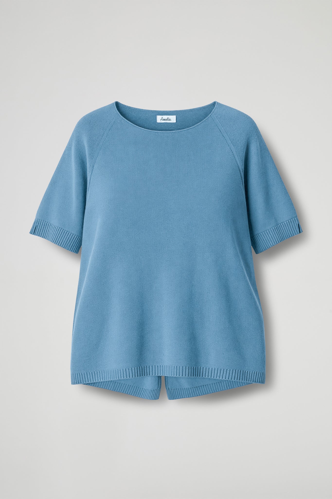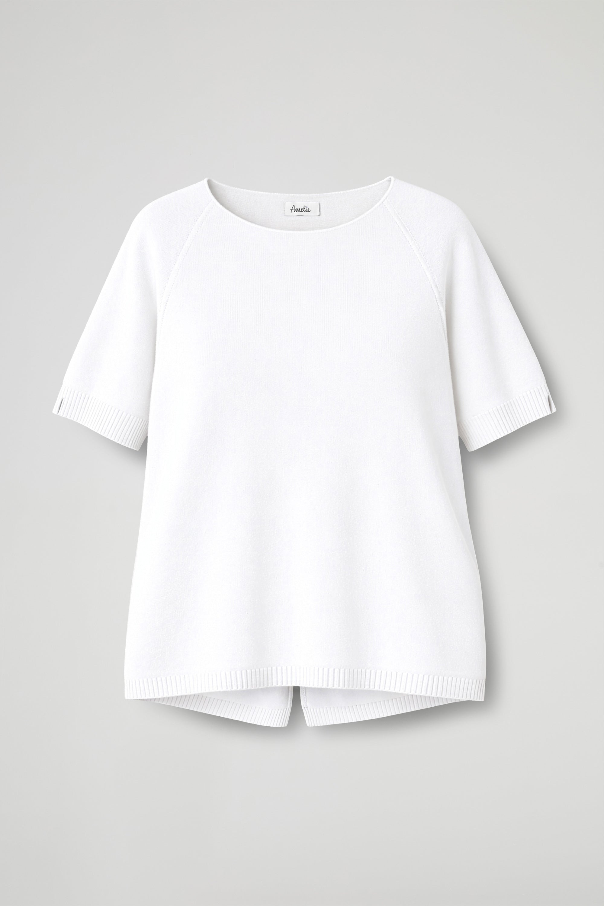 Maglia in morbida viscosa dal gusto essenziale e raffinato. Il filato leggero e piacevole sulla pelle avvolge con naturalezza, mentre il girocollo ampio e le maniche corte con taglio raglan donano una linea pulita e contemporanea. Rifinita con bordi a costine su fondo e maniche per un tocco curato e una vestibilità confortevole.