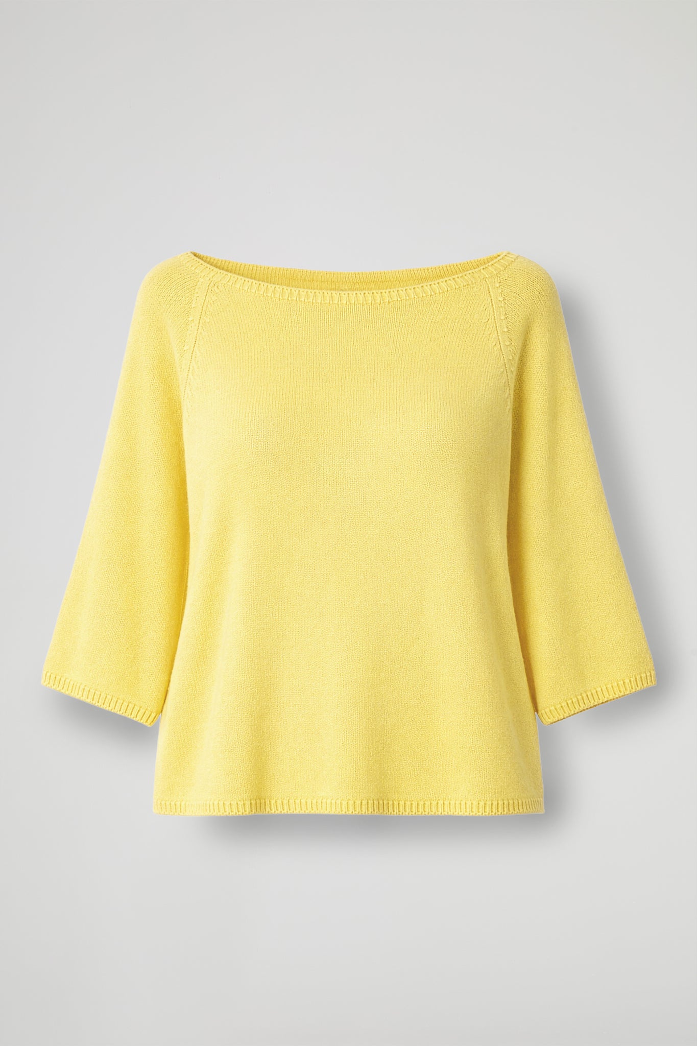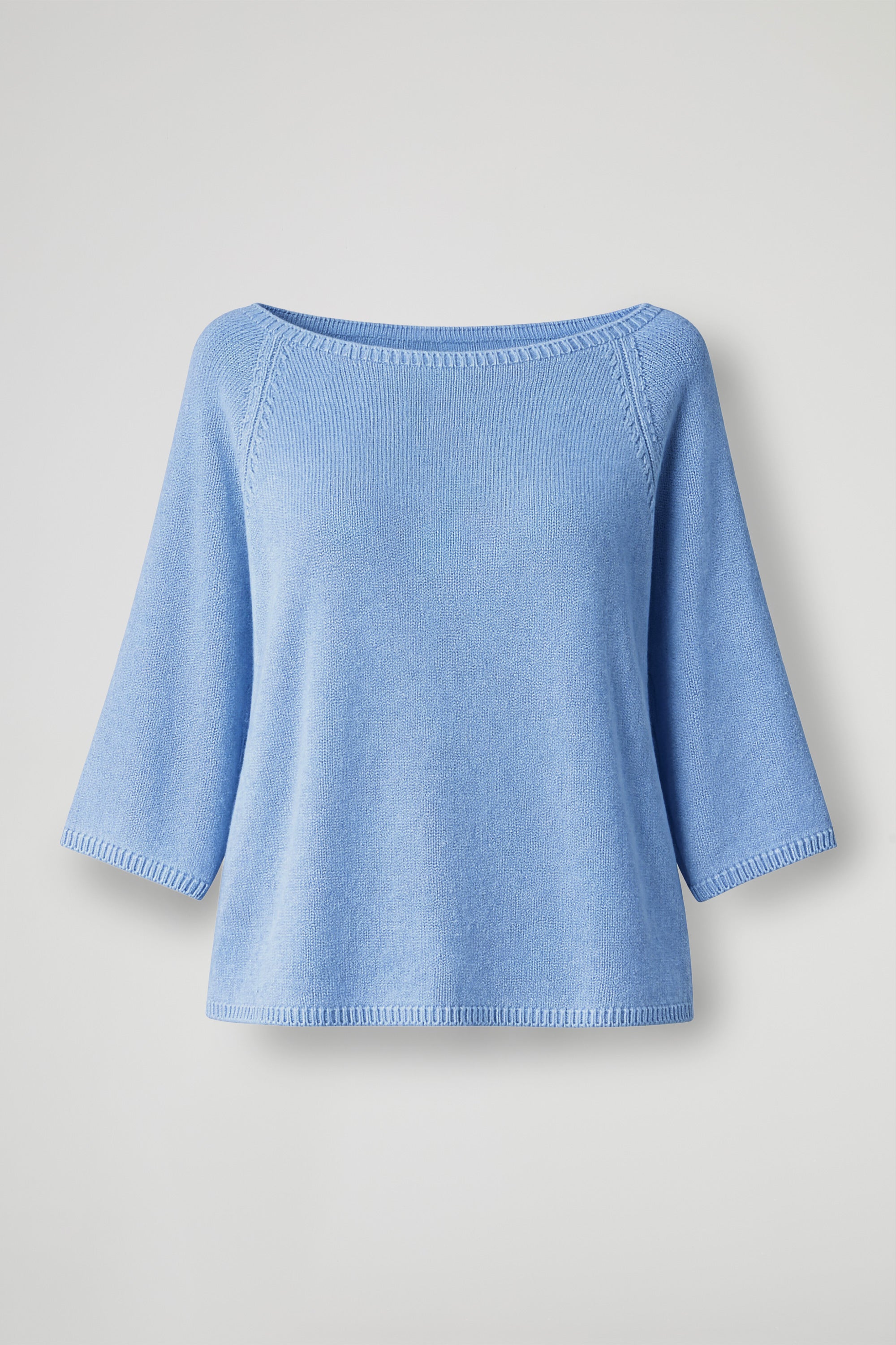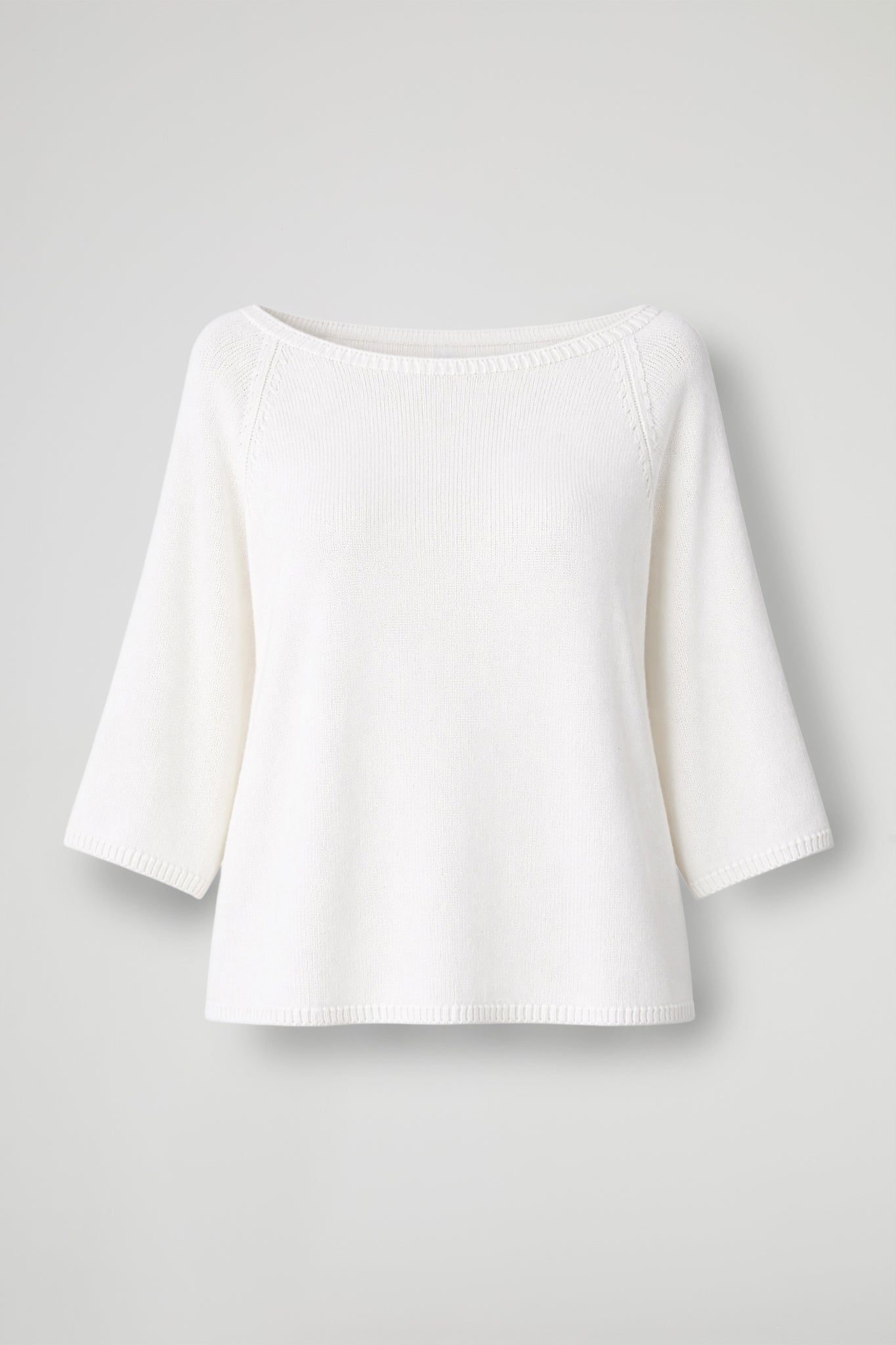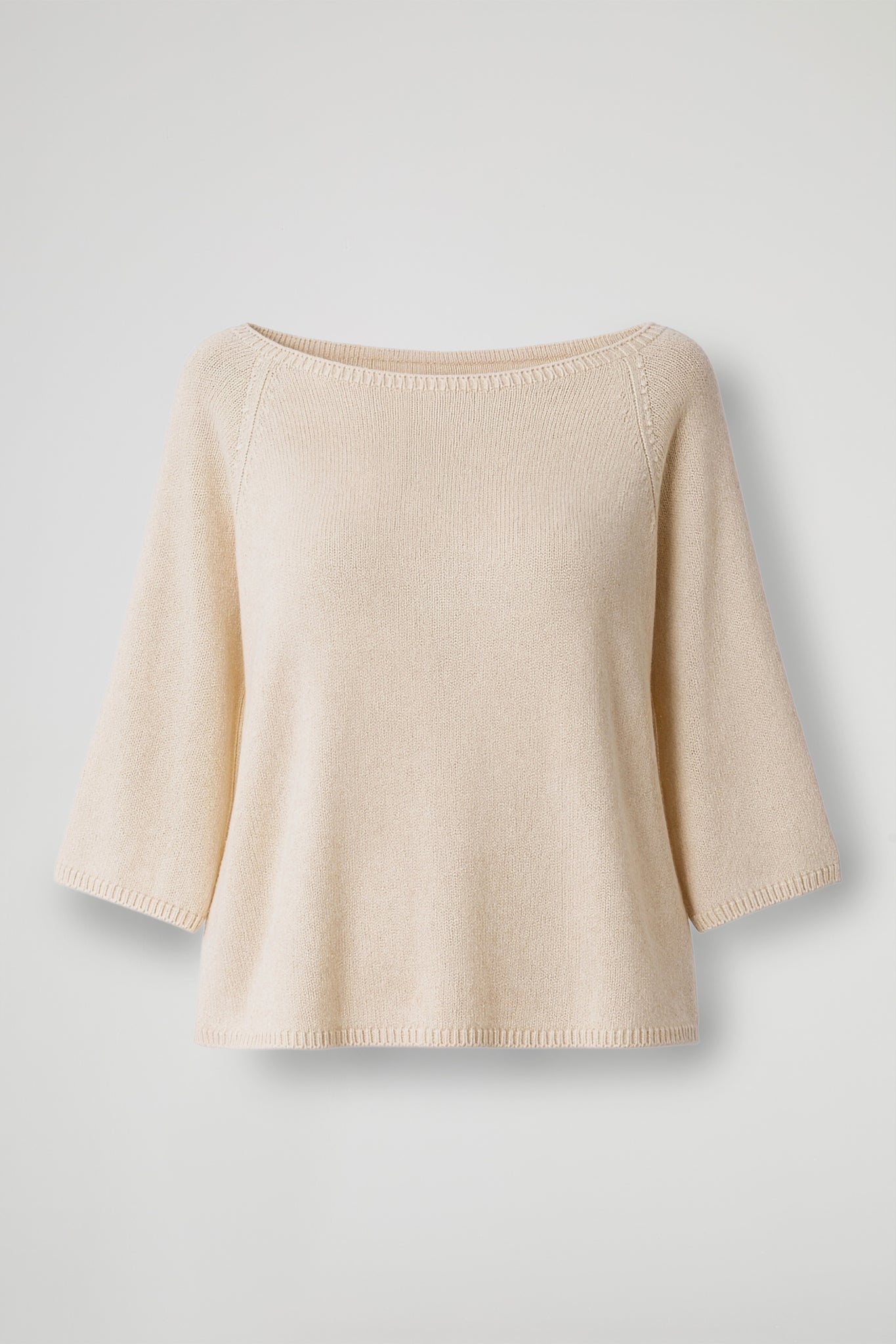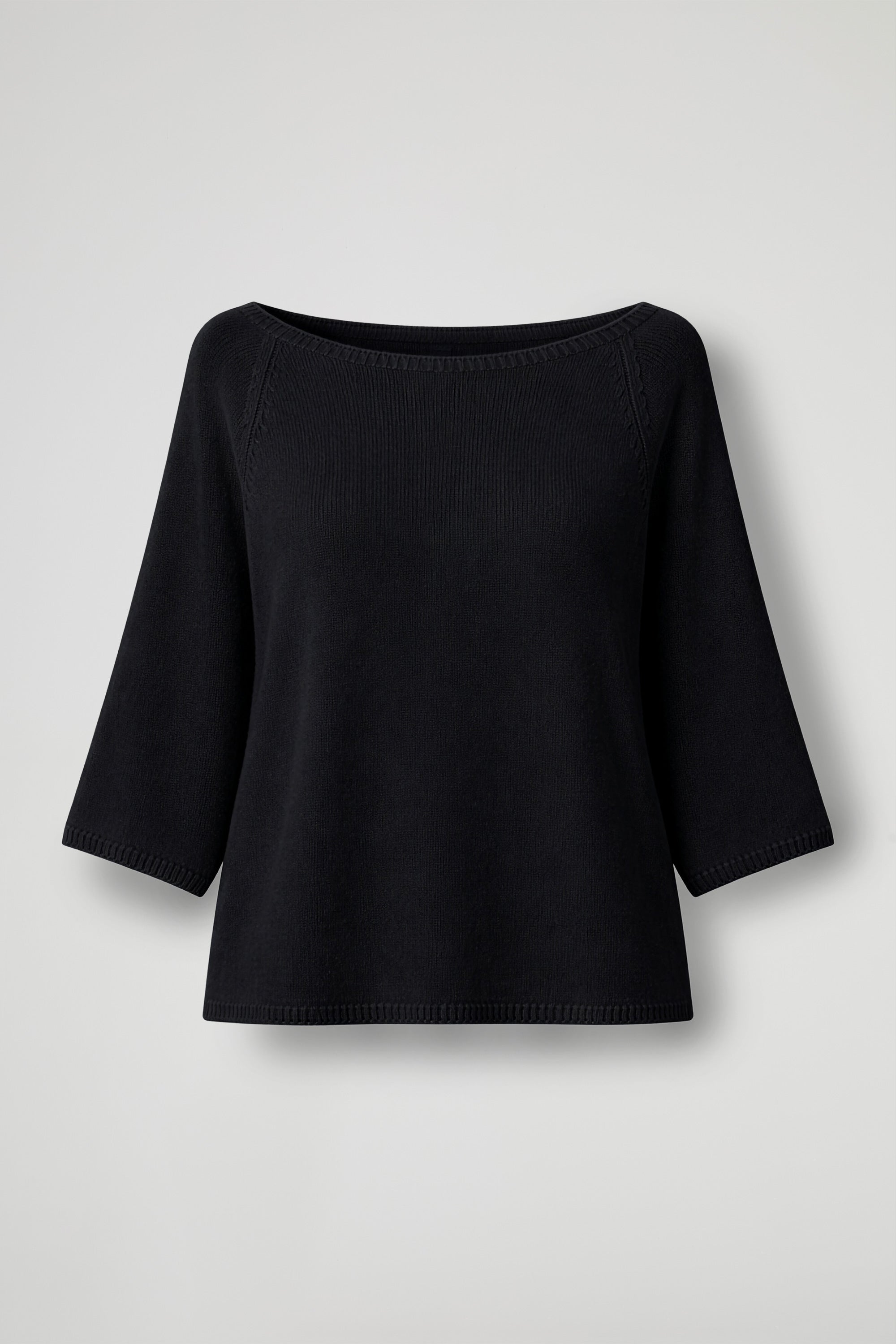 Maglia in morbida maglina di viscosa, collo a barca con dettaglio a costine, spalla scesa, manica 3/4. Linea mpia