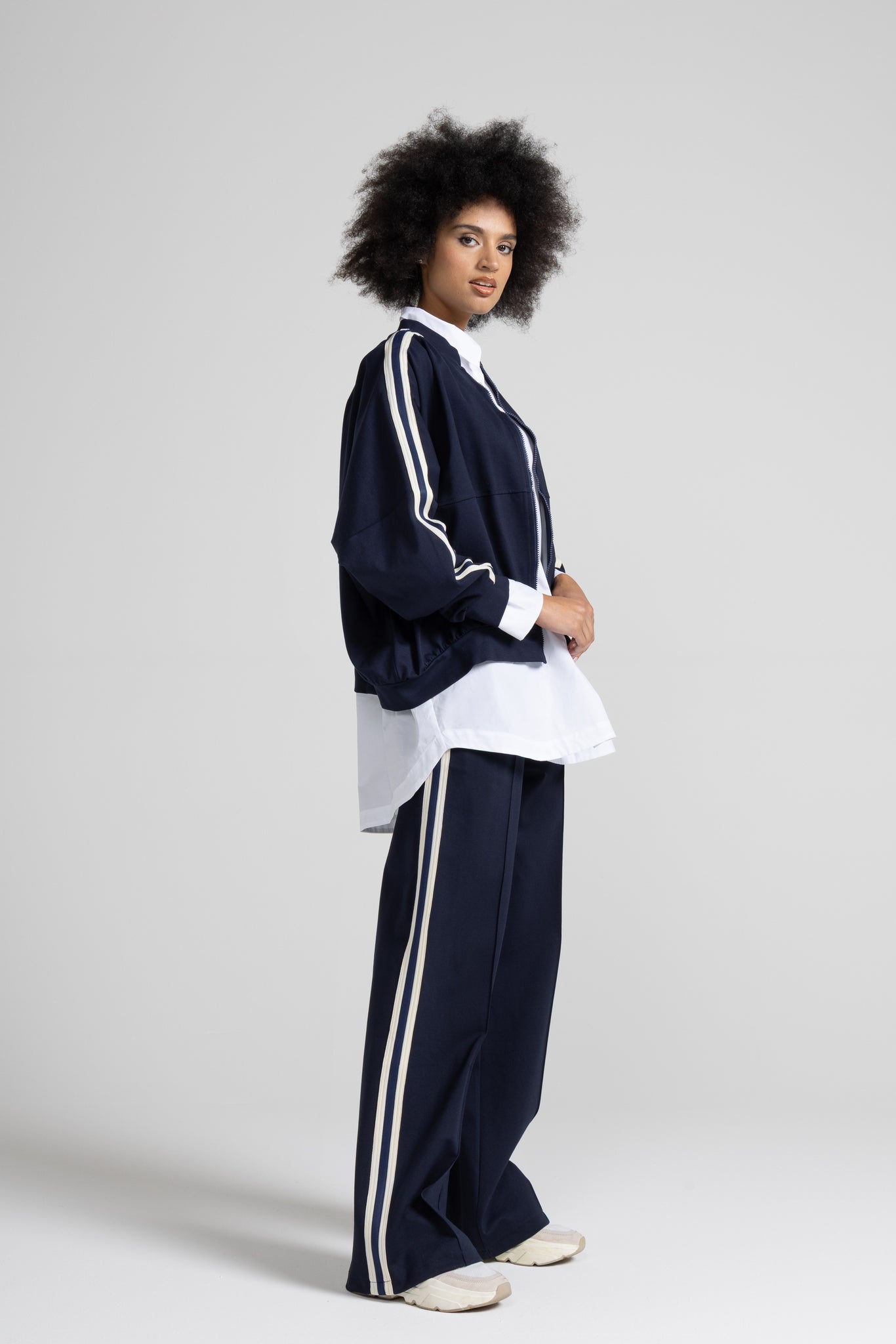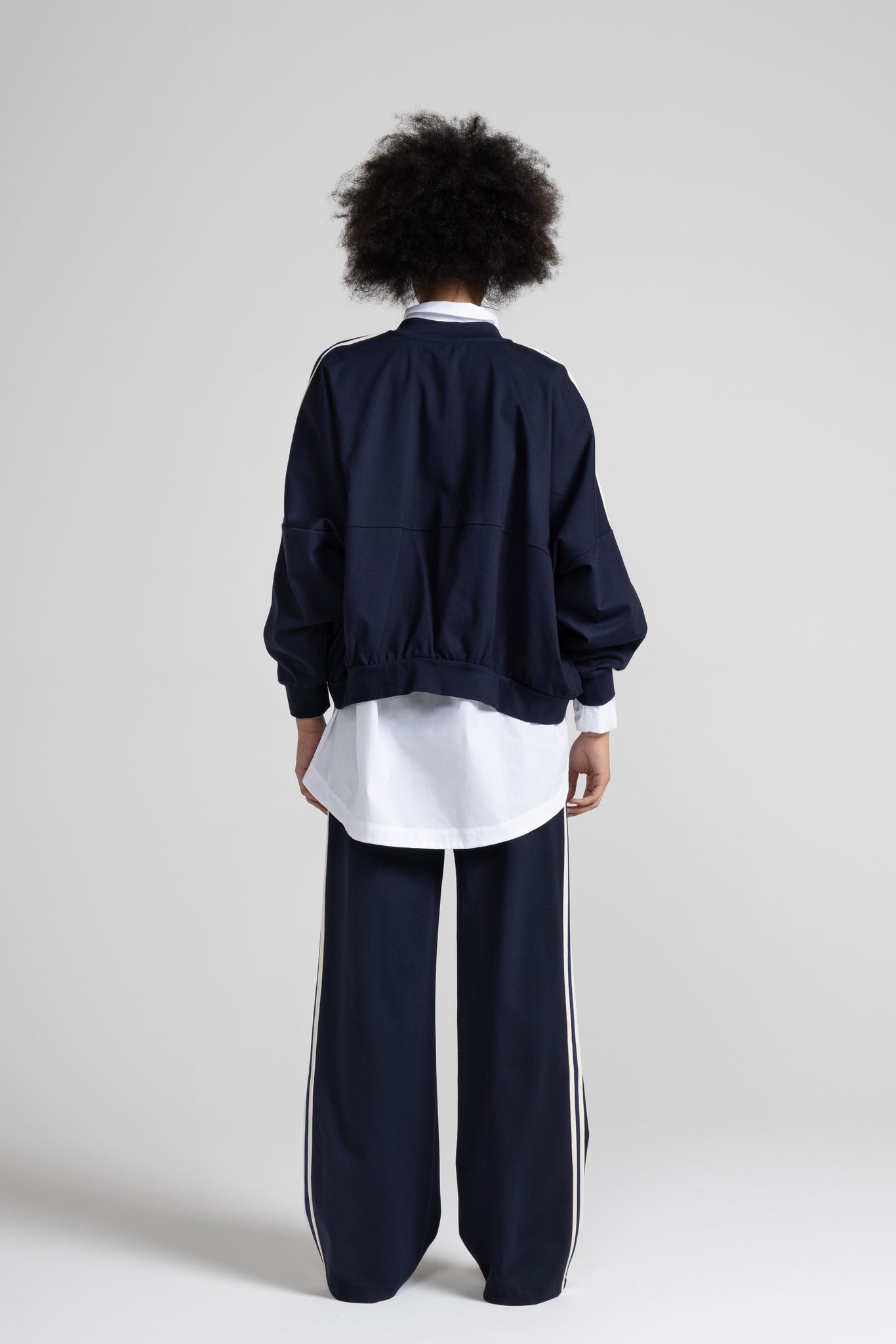 PANTALONE PALAZZO IN PUNTO MILANO DI VISCOSA, ELASTICO E COULISSE REGOLABILE IN VITA, DETTAGLIO PASSAMANERIA SULLA LUNGHEZZA DELLA GAMBA.