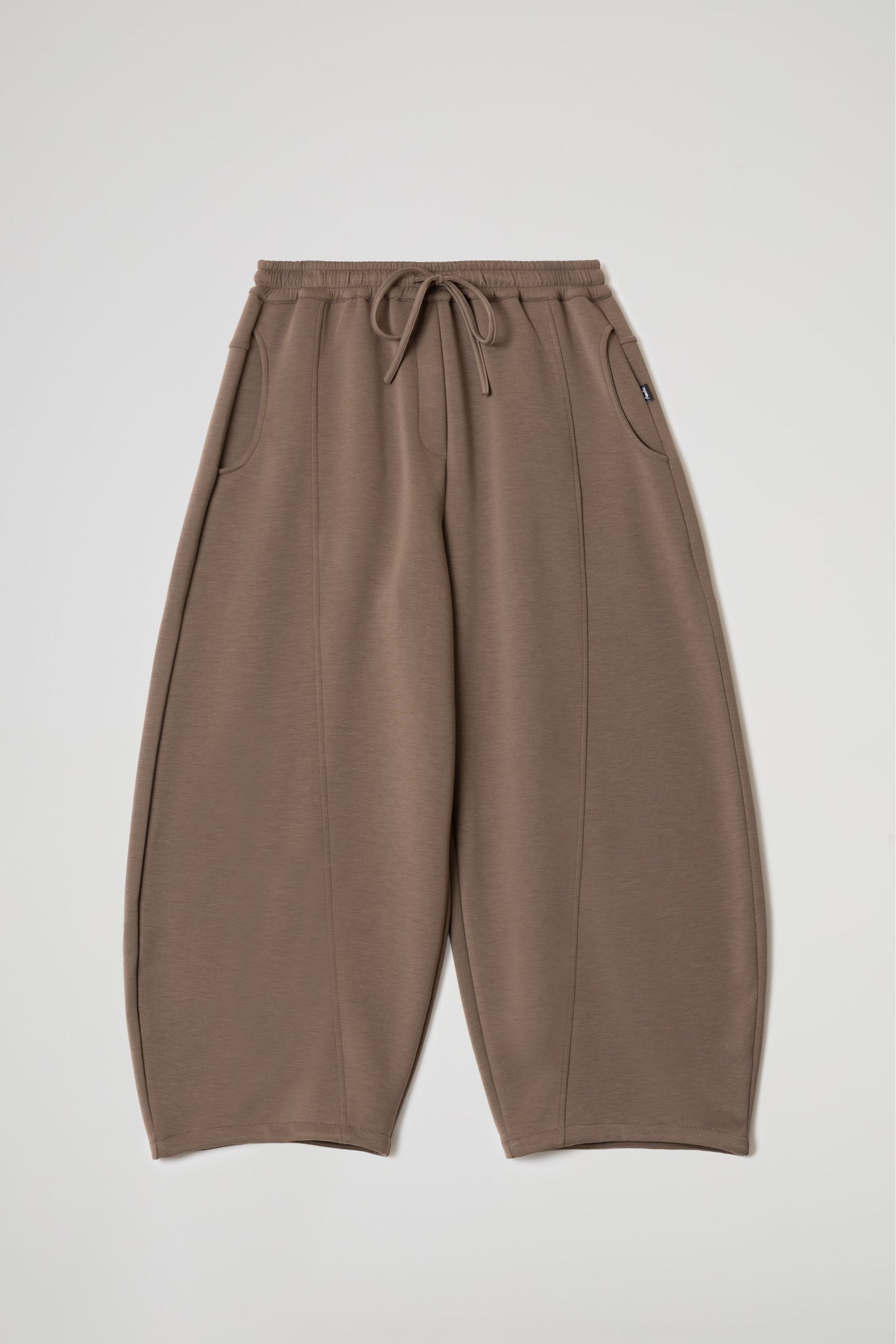 Taglio baggy, vita elastica con coulisse regolabile in tono, due tasche laterali, cucitura centrale frontale, orlo ribattuto sul fondo. Linea ampia.