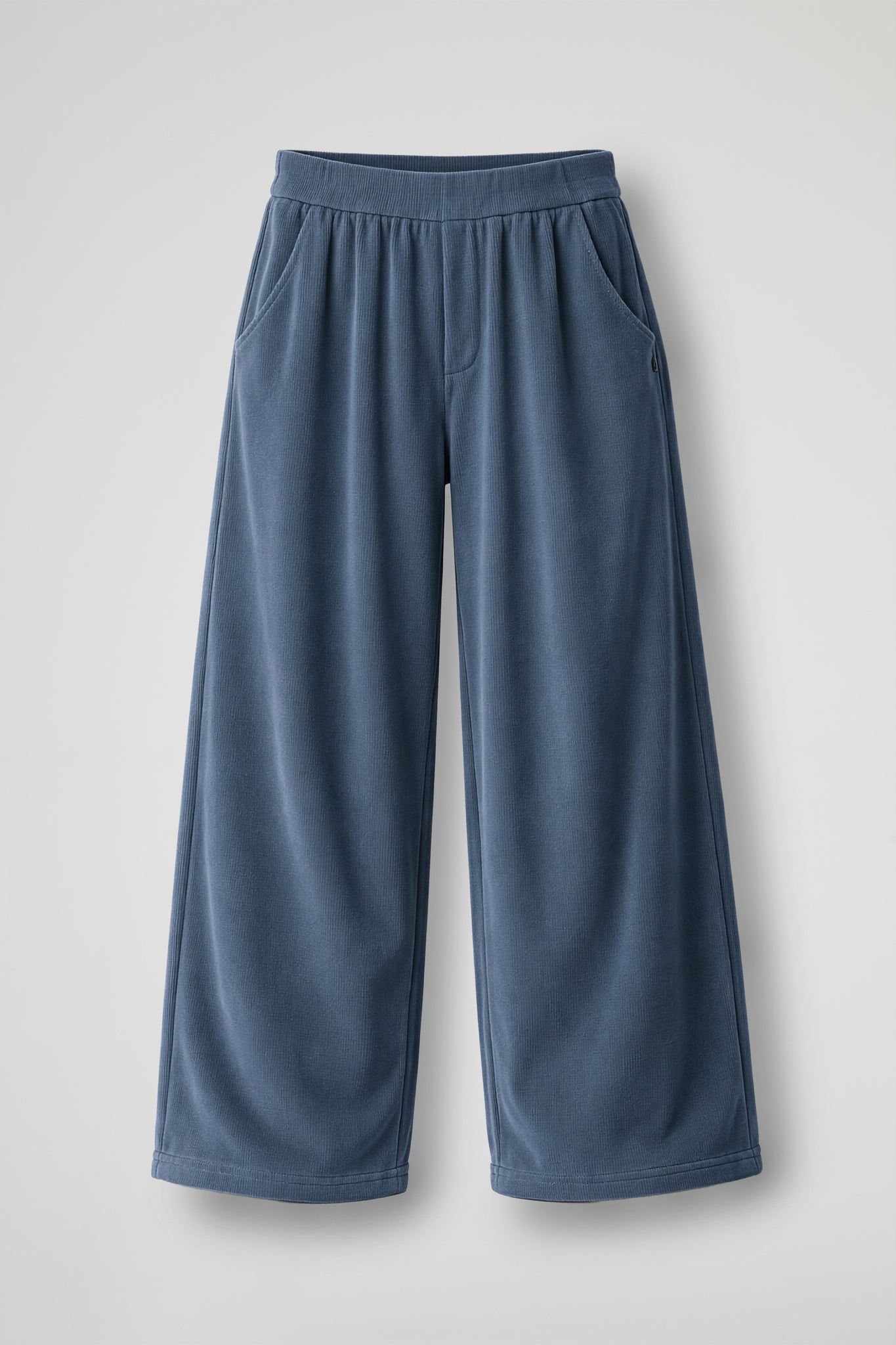Pantalone millerighe in velluto, fascia elastica in vita, due tasche laterali a taglio obliquo, pattina sul davanti, taglio carrè sul retro, gamba ampia, orlo ribattuto alto sul fondo .