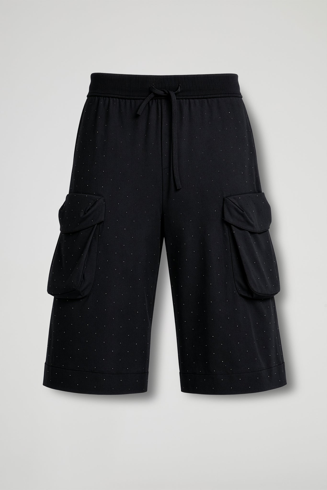 Bermuda dal mood urban-chic, illuminato da una delicata micro puntinatura di strass. Il modello ha vita elasticizzata con coulisse per una vestibilità regolabile e super confortevole, e si distingue per le maxi tasche cargo con patta sui lati, che aggiungono carattere e funzionalità. La gamba ampia con fondo rifinito a fascia completa il design moderno e deciso.