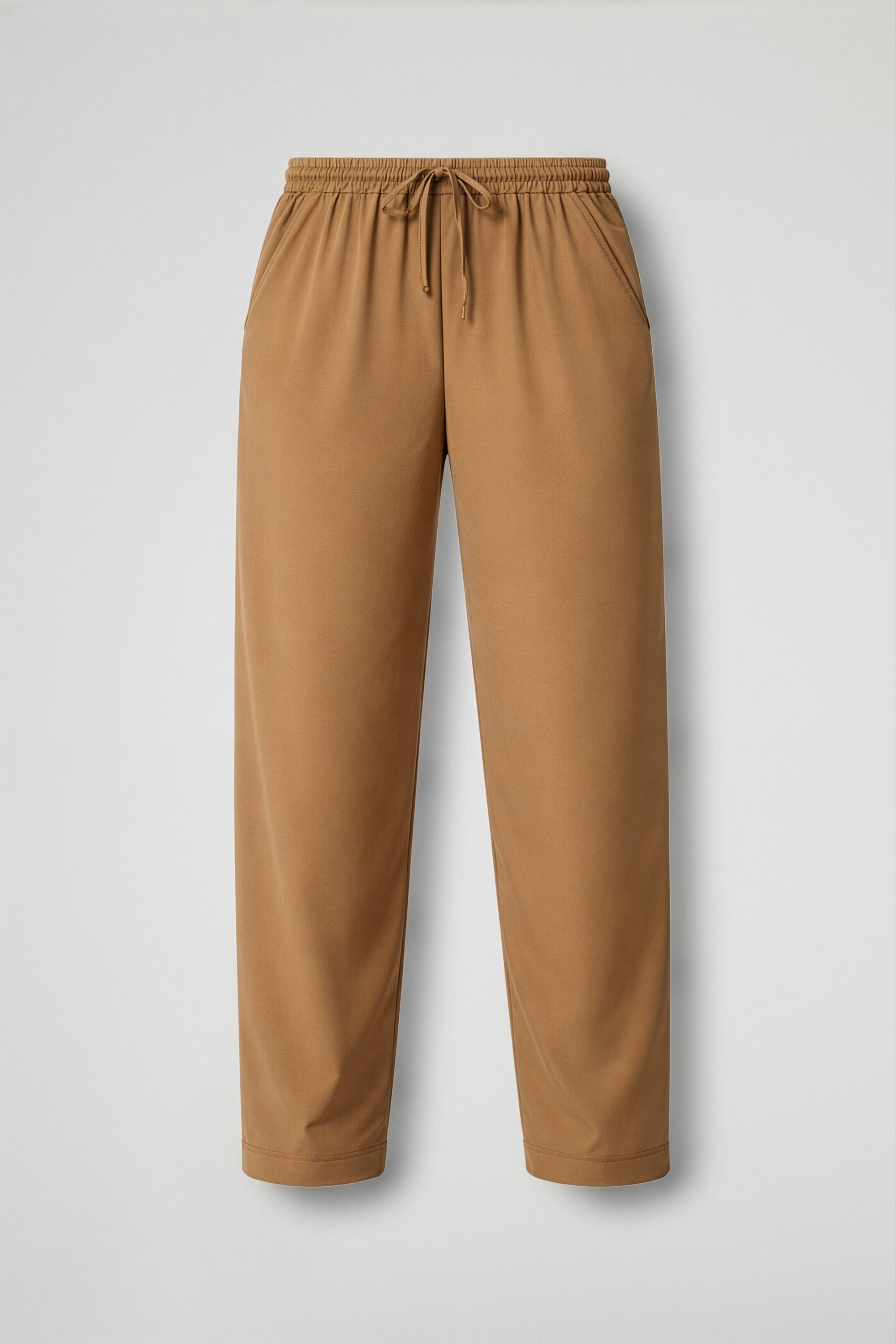 Pantaloni regular fit, vita elasticizzata con leggera arricciatura e coulisse regolabile, tasche all'americana, gamba dritta.