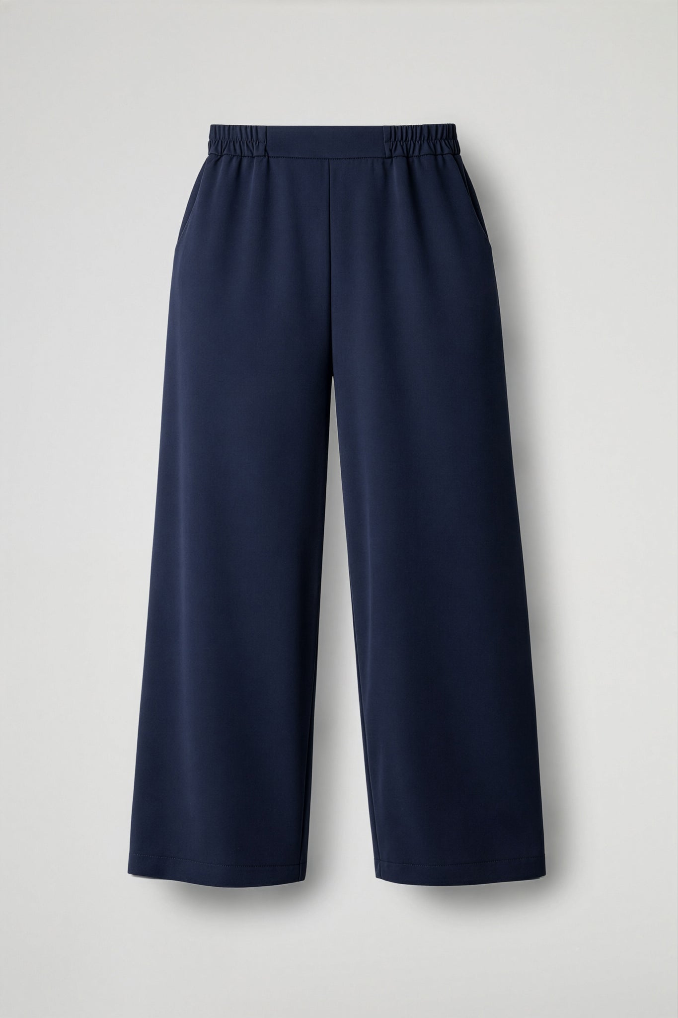 Pantalone a palazzo in tessuto fluido, vita elasticizzata con apertura laterale con zip a scomparsa, tasche alla americana. Linea confortevole, orlo dritto e pulito. Linea regular