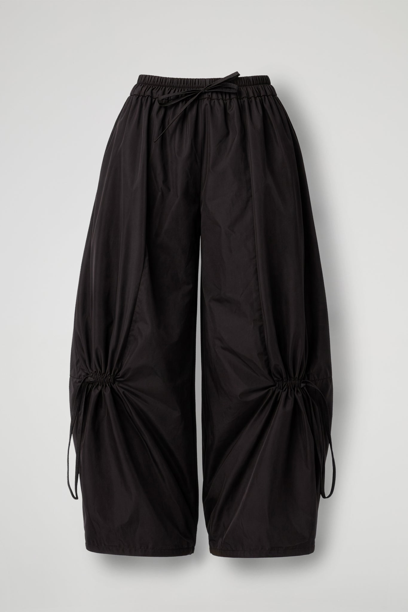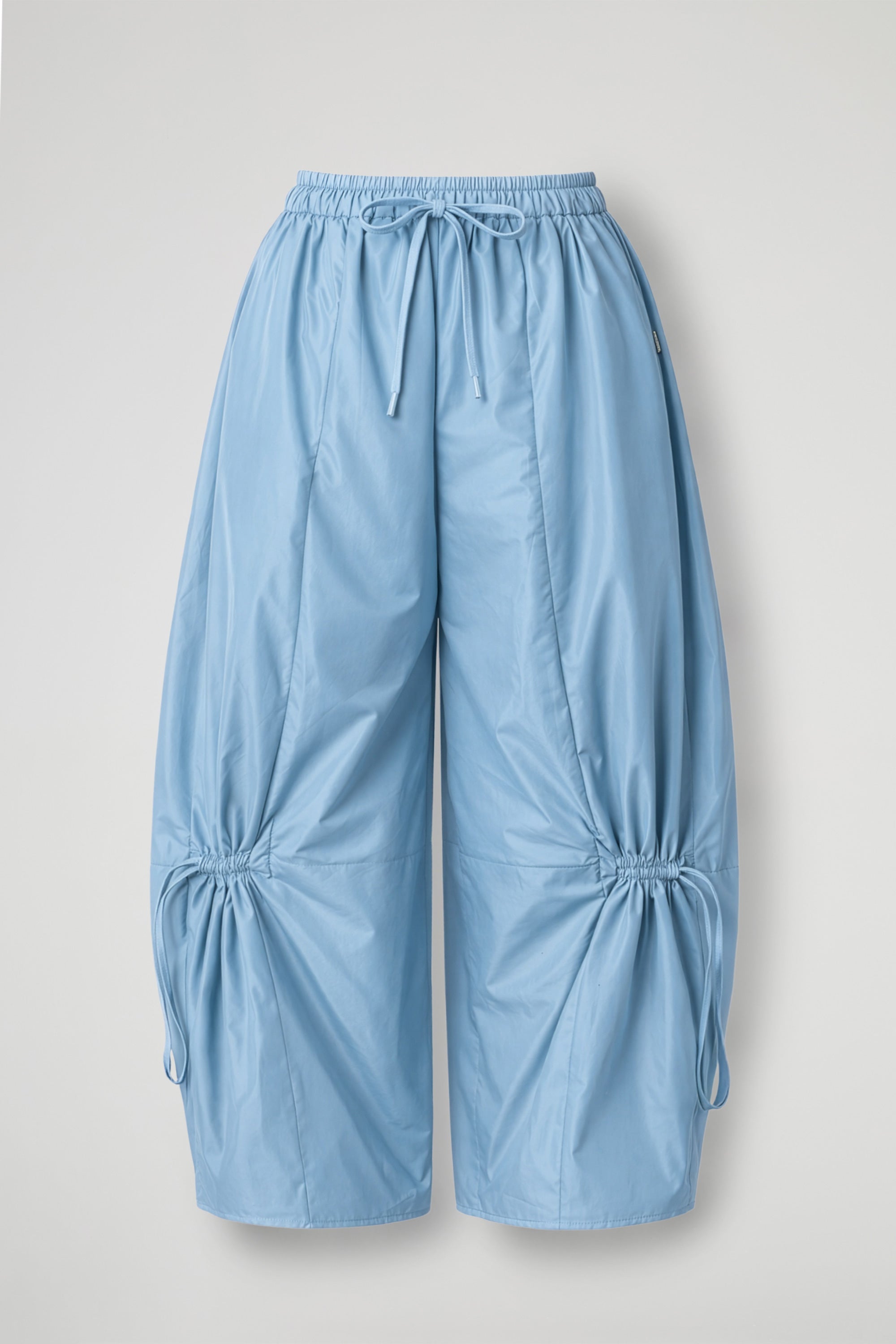 Pantaloni baggy realizzati in tessuto tecnico effetto nacré, dalla finitura luminosa che dona subito un twist moderno al look. La silhouette è ampia e fluida, con vita elasticizzata e coulisse per una vestibilità regolabile. Il dettaglio che fa la differenza sono i laccetti con arricciatura sulla parte bassa della gamba: puoi stringerli per creare volume e movimento, oppure lasciarli morbidi per un effetto più lineare.