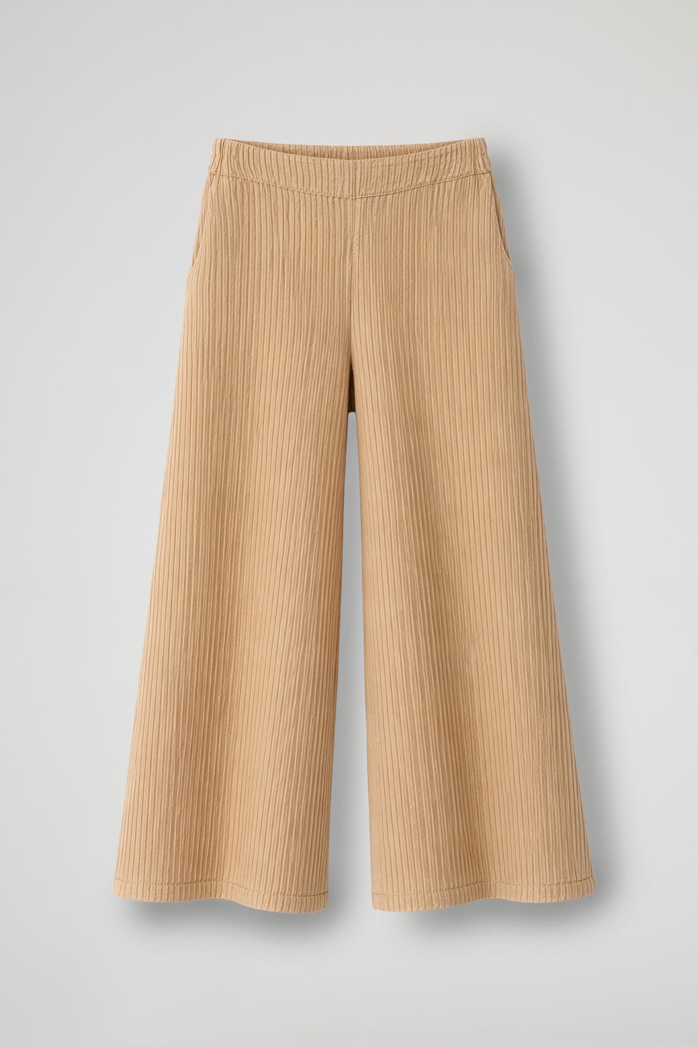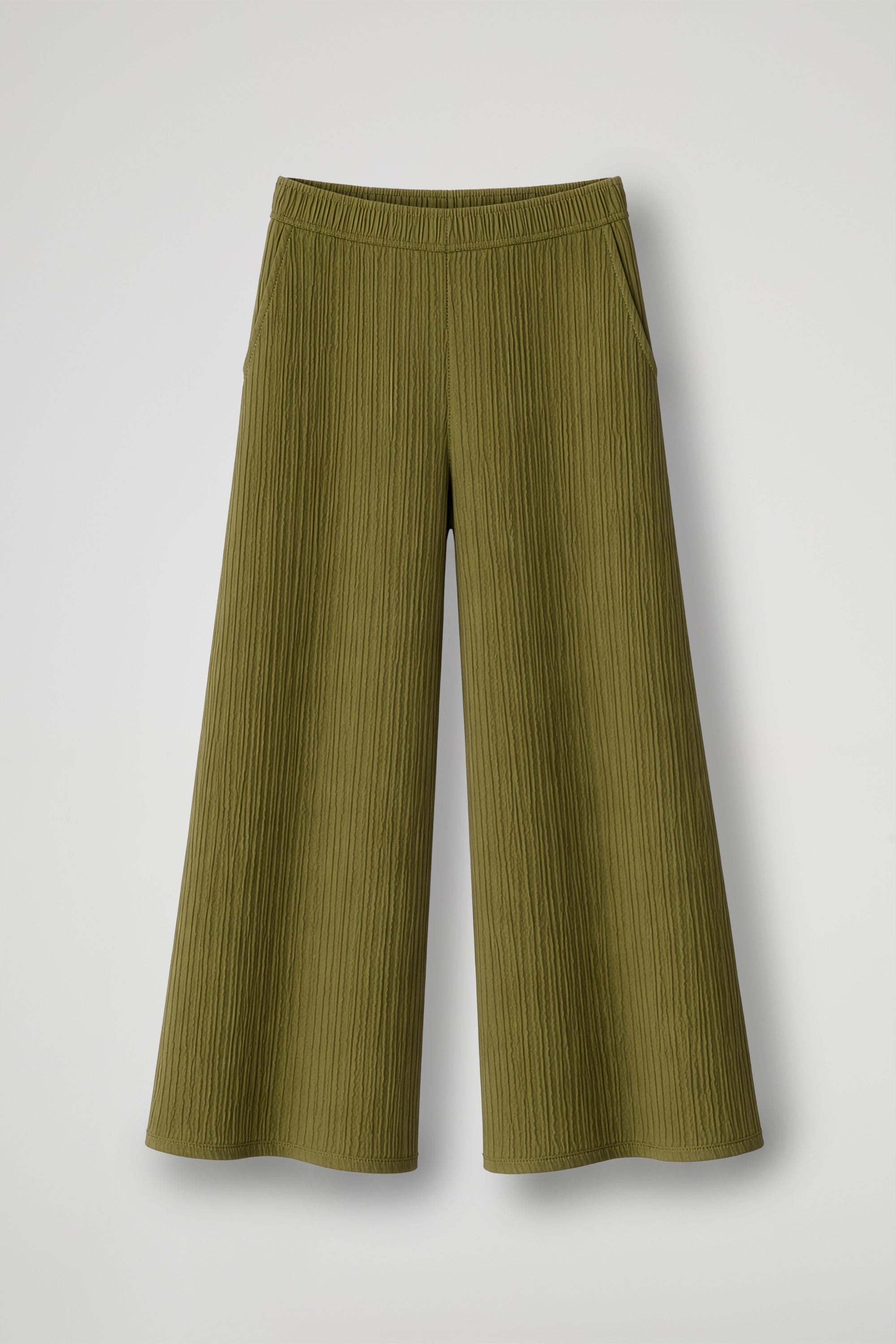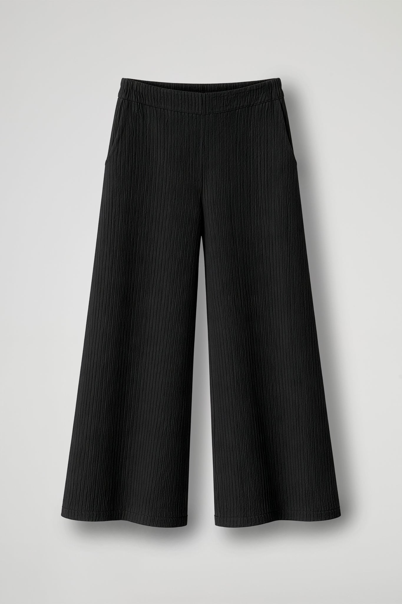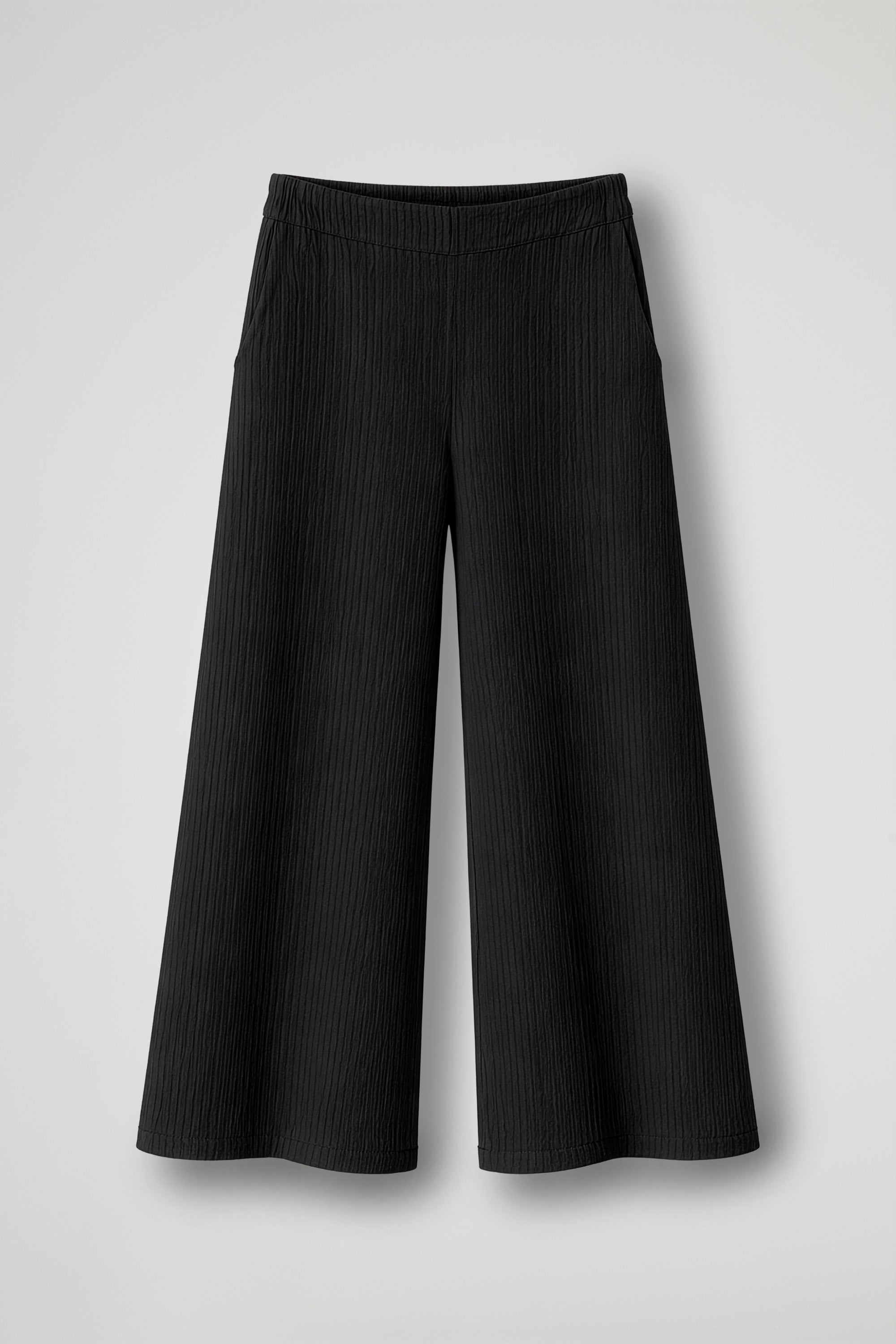 Pantalone cropped in tessuto goffrato, elastico in vita, tasche all'americana, gamba ampia, orlo pulito sul fondo.