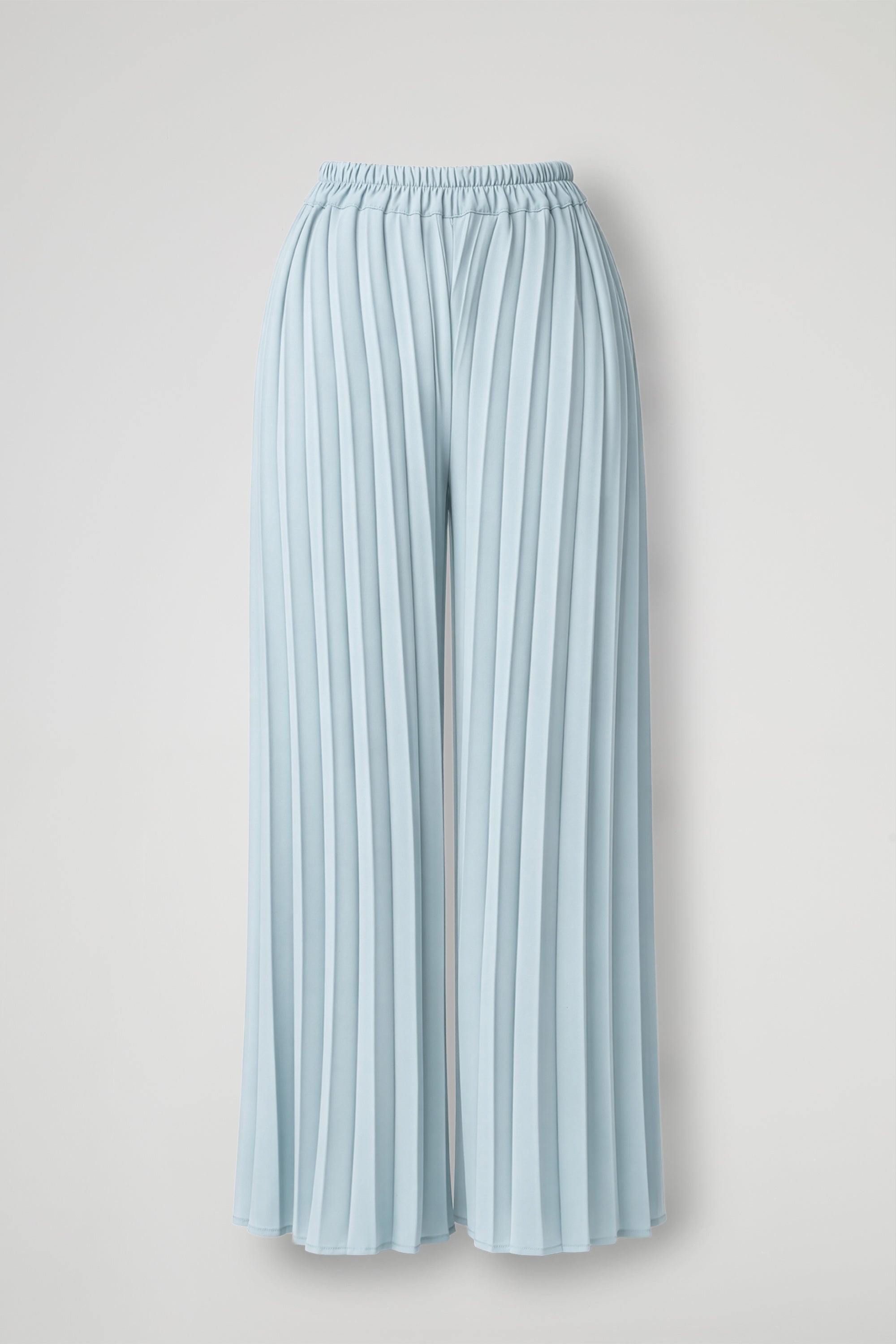 Pantaloni lunghi in plissé, dalla linea ampia e dal movimento molto fluido. La vita elasticizzata con arricciatura regolare assicura comfort e vestibilità facile, adattandosi bene al punto vita senza costringere, le pieghe verticali a tutta lunghezza creano un effetto ottico slanciante e donano al capo un look elegante ma versatile, perfetto sia di giorno che di sera. La gamba scende dritta e morbida fino al fondo, con un’ampiezza uniforme che accompagna il passo e valorizza la silhouette.