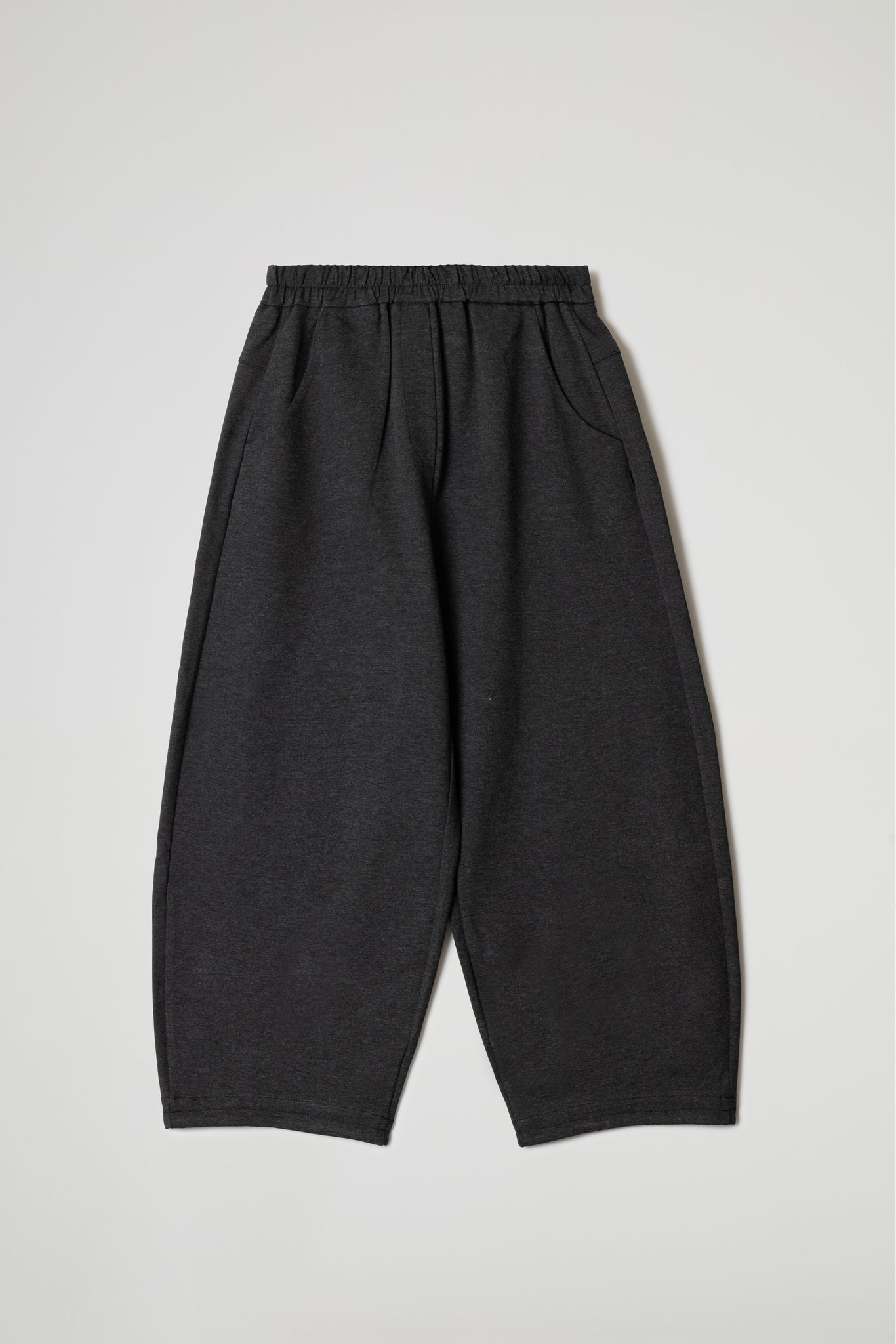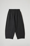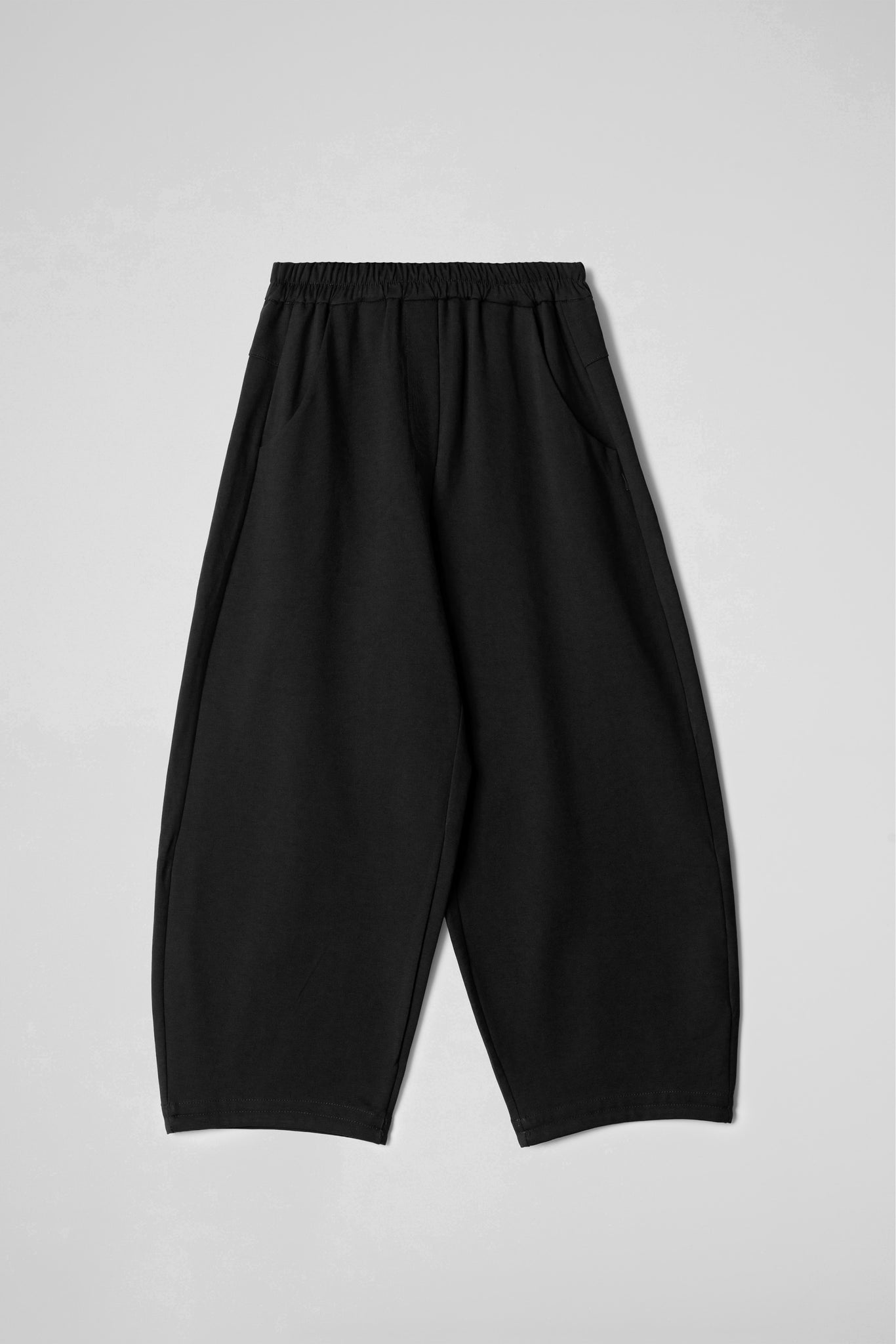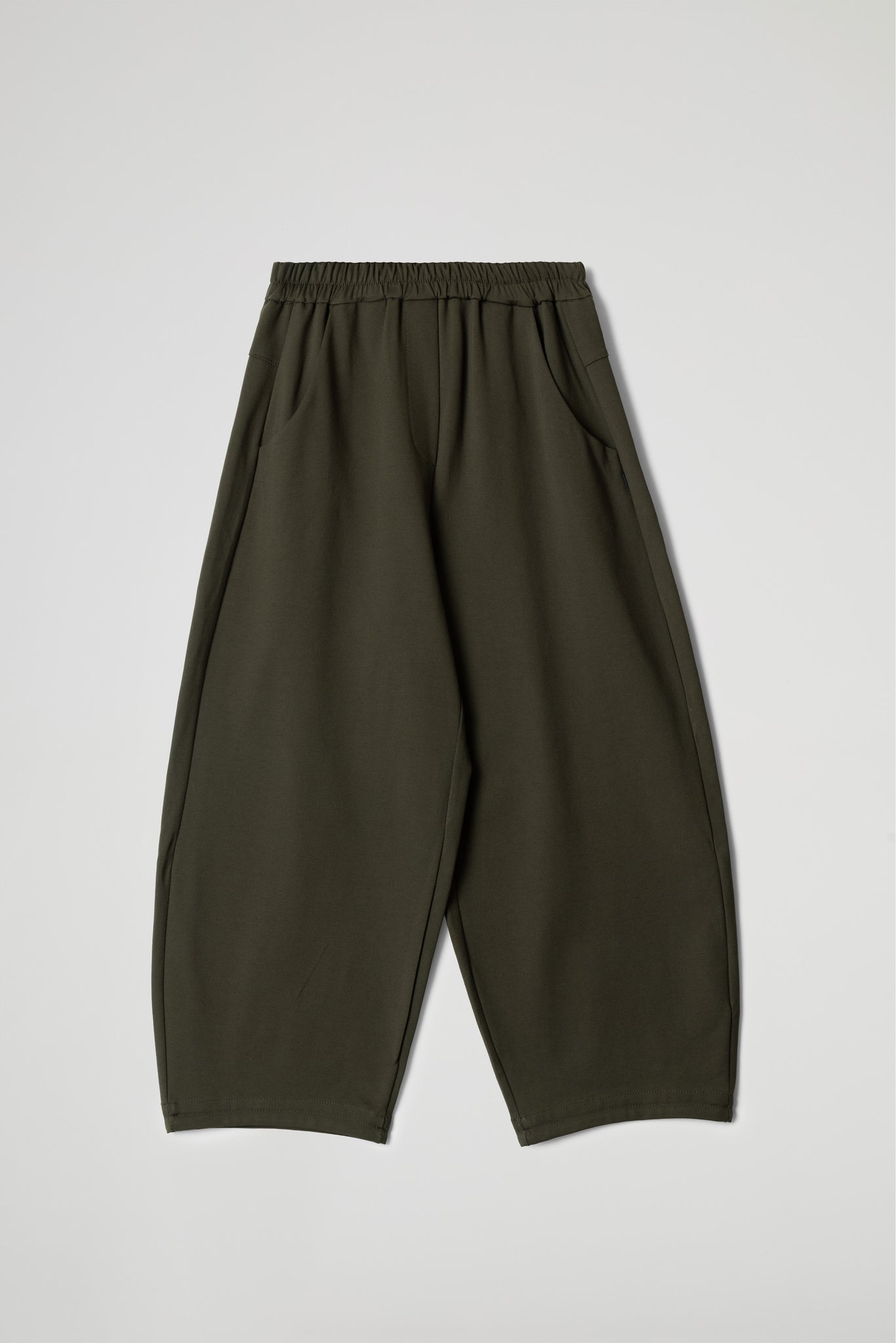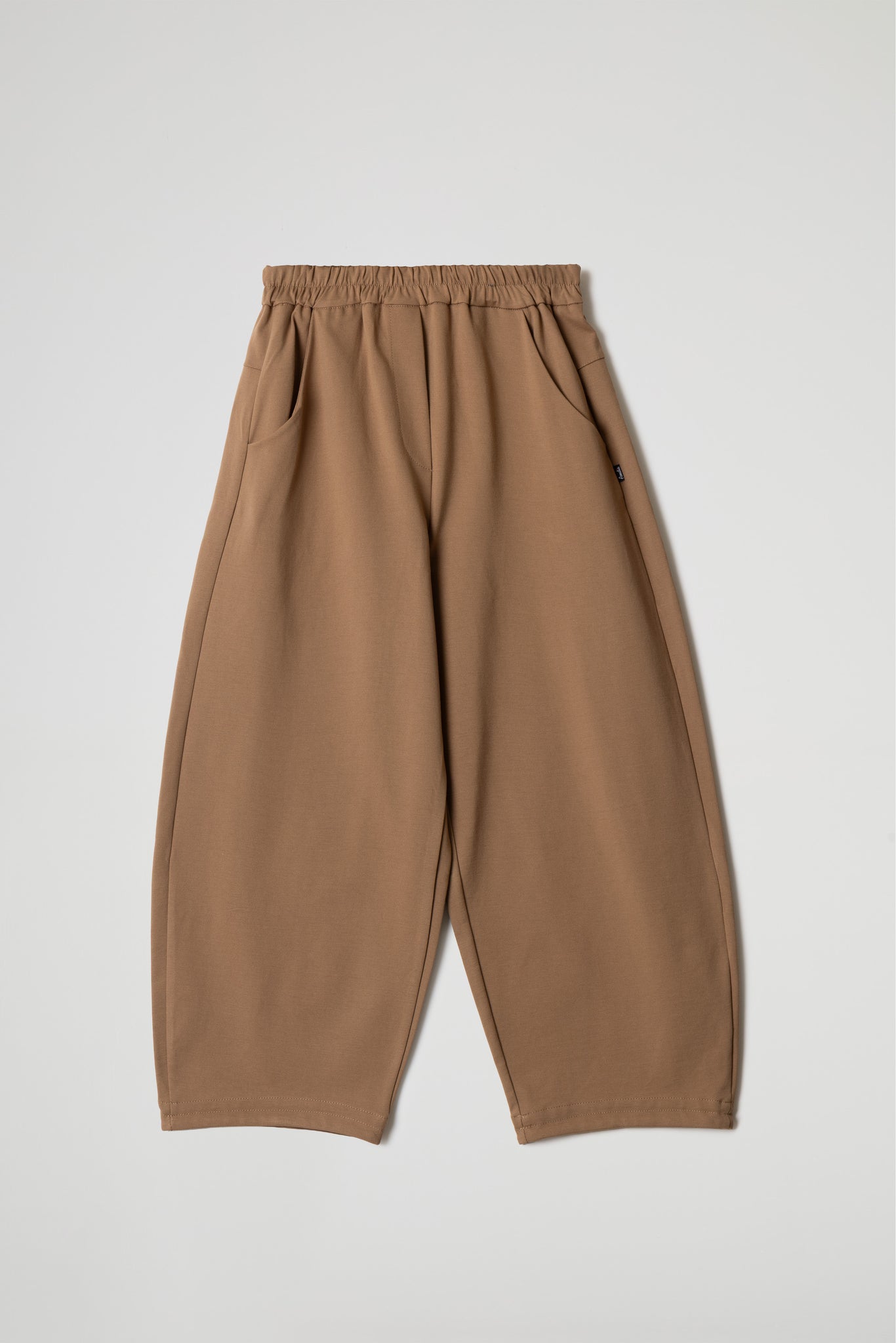 Modello baggy, elastico in vita, due tasche laterali a taglio obliquo, pattina sul davanti, taglio carrè sul retro, gamba ampia, orlo ribattuto alto sul fondo .