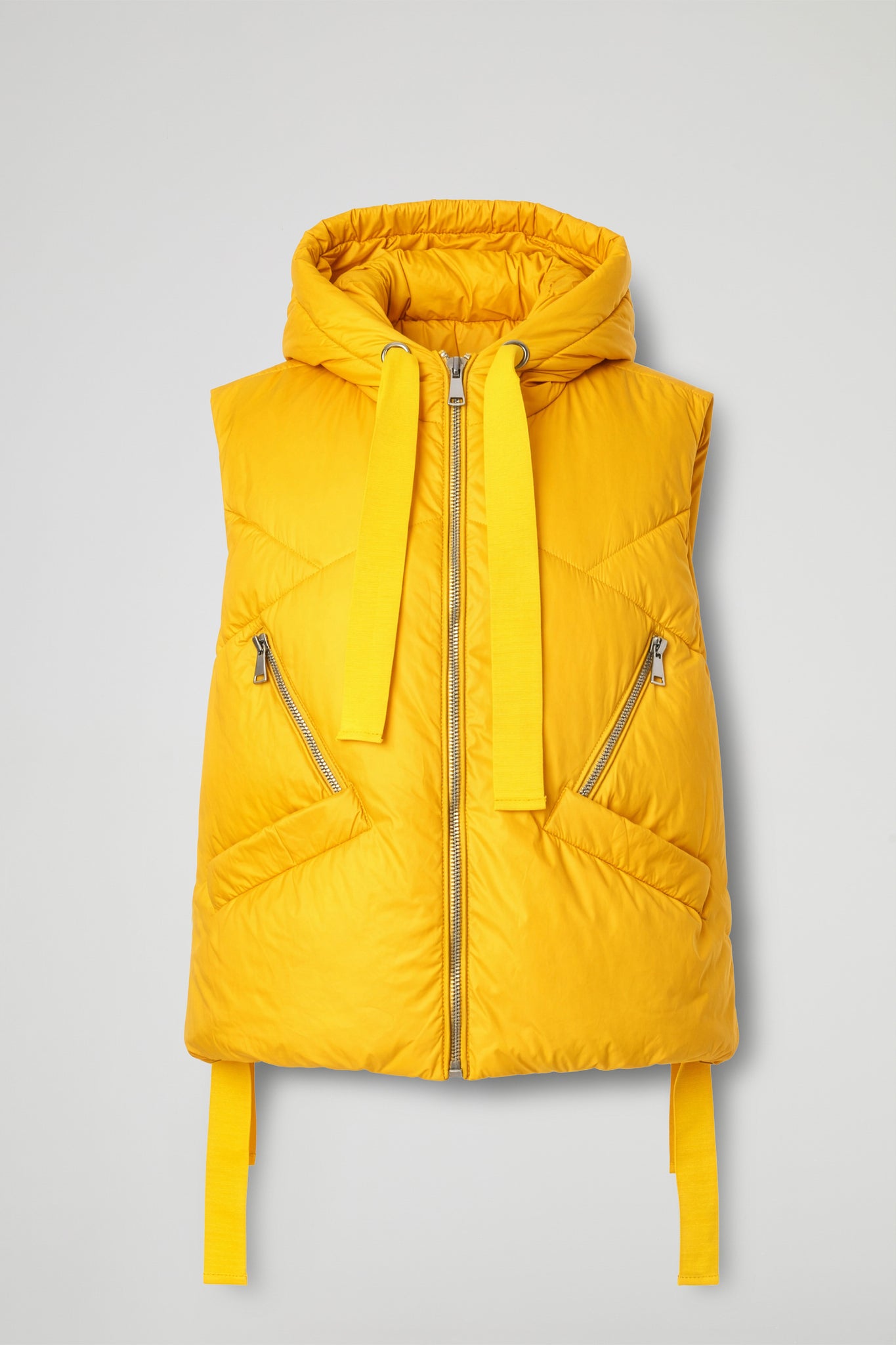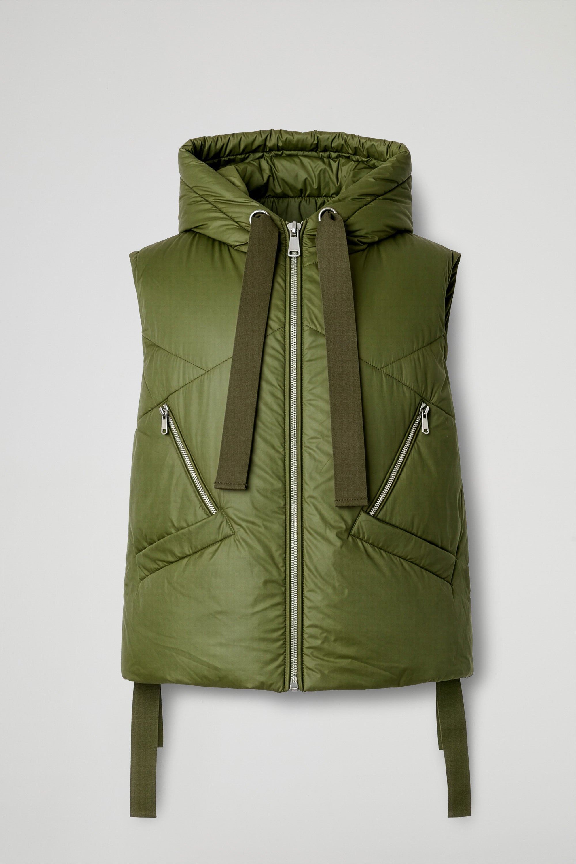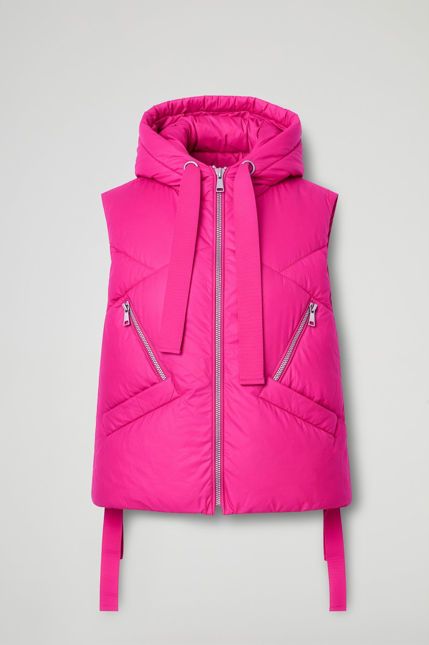 Gilet imbottito dal carattere deciso, dal cappuccio avvolgente e dai maxi nastri in tono che  aggiungono un twist super fashion al capo. La trapuntatura geometrica disegna la silhouette e dona volume in modo leggero e contemporaneo. Pratico e curato nei dettagli, grazie alla zip frontale, alle tasche laterali e alla tasca con zip diagonale sul davanti.