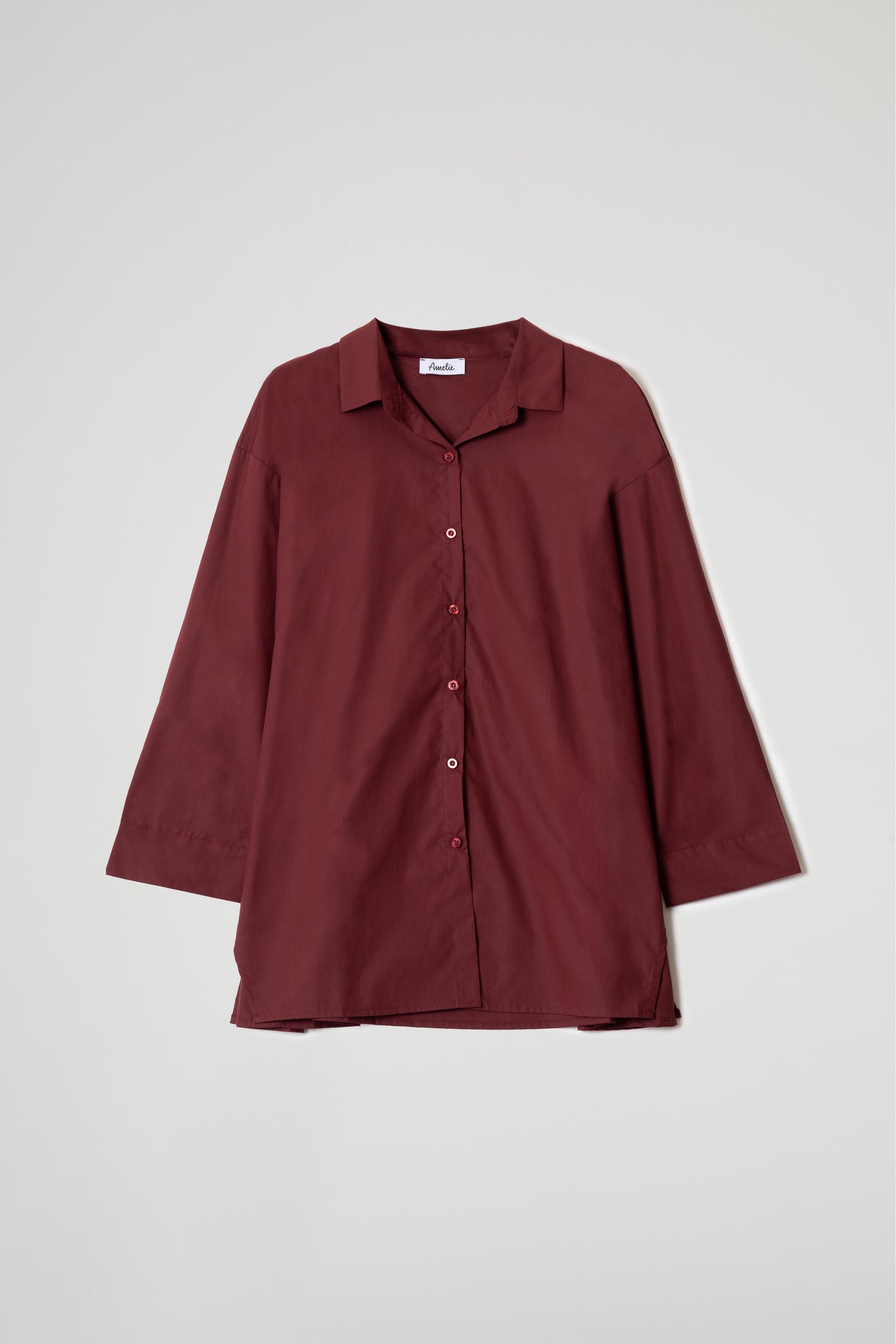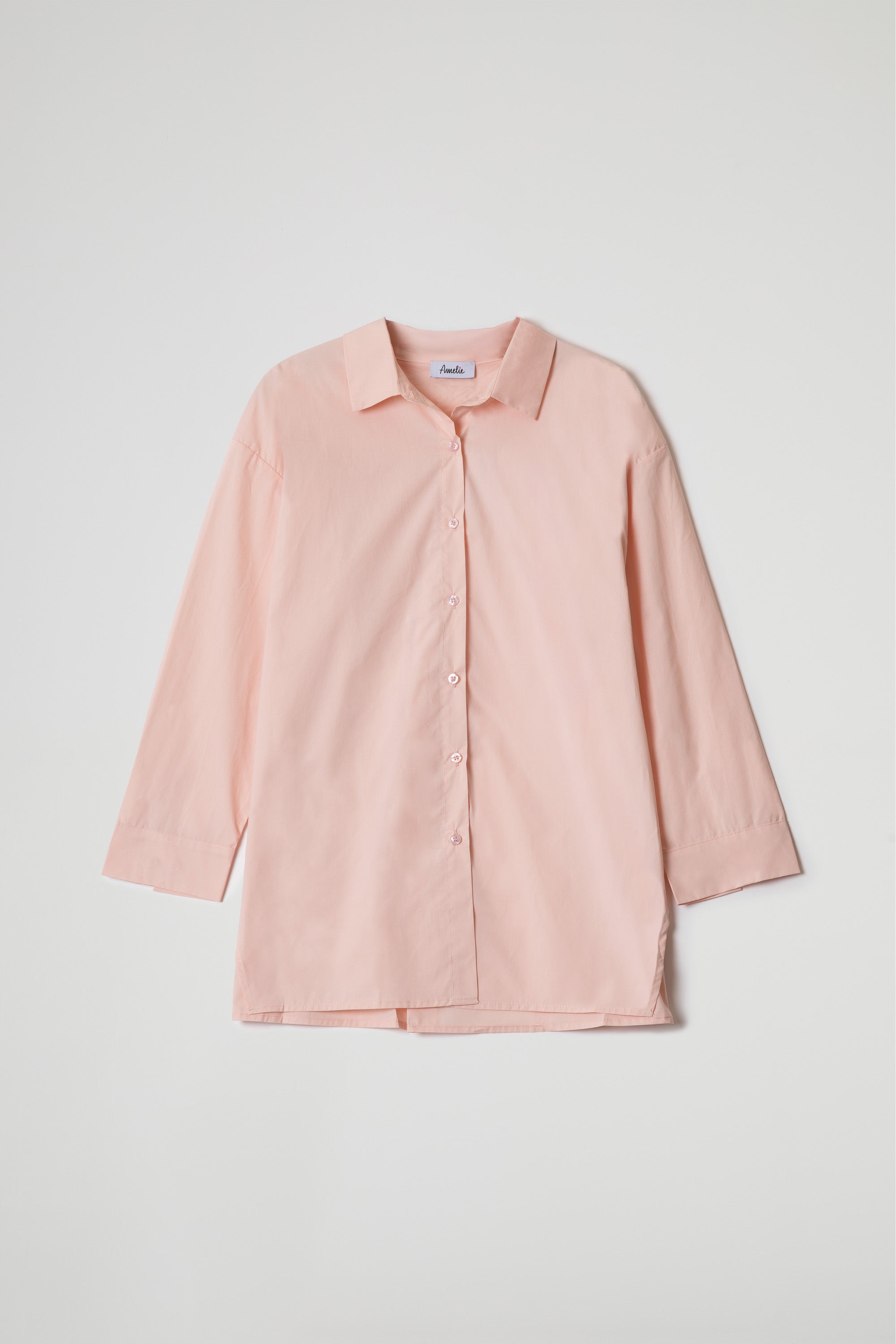 Camicia over in popeline di cotone, collo classico con rever morbido, manica lunga con polso strutturato e bottone singolo, chiusura frontale con bottoni tono su tono, taglio a carrè con piega sul retro, spacchi laterali profondi. Linea ampia.