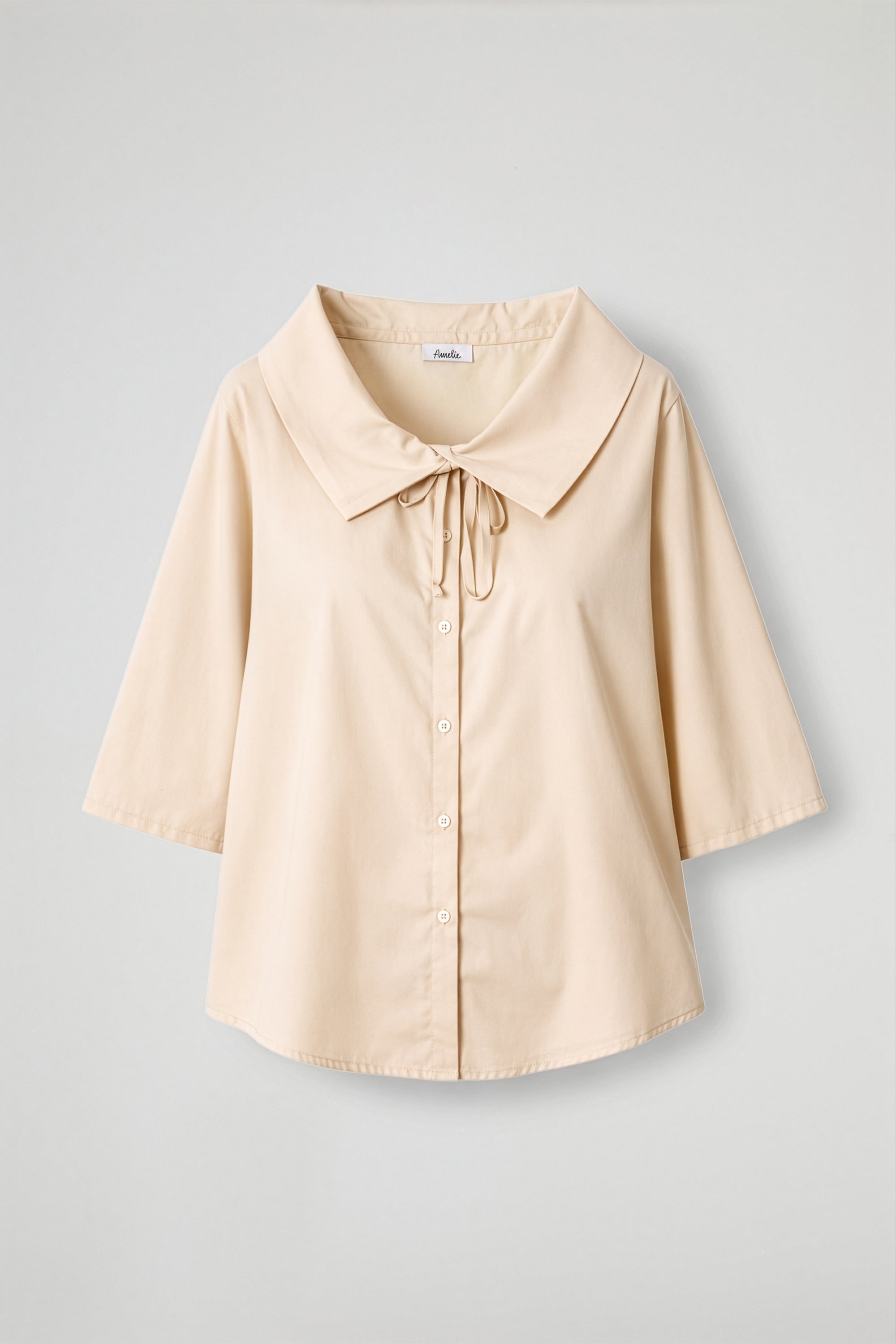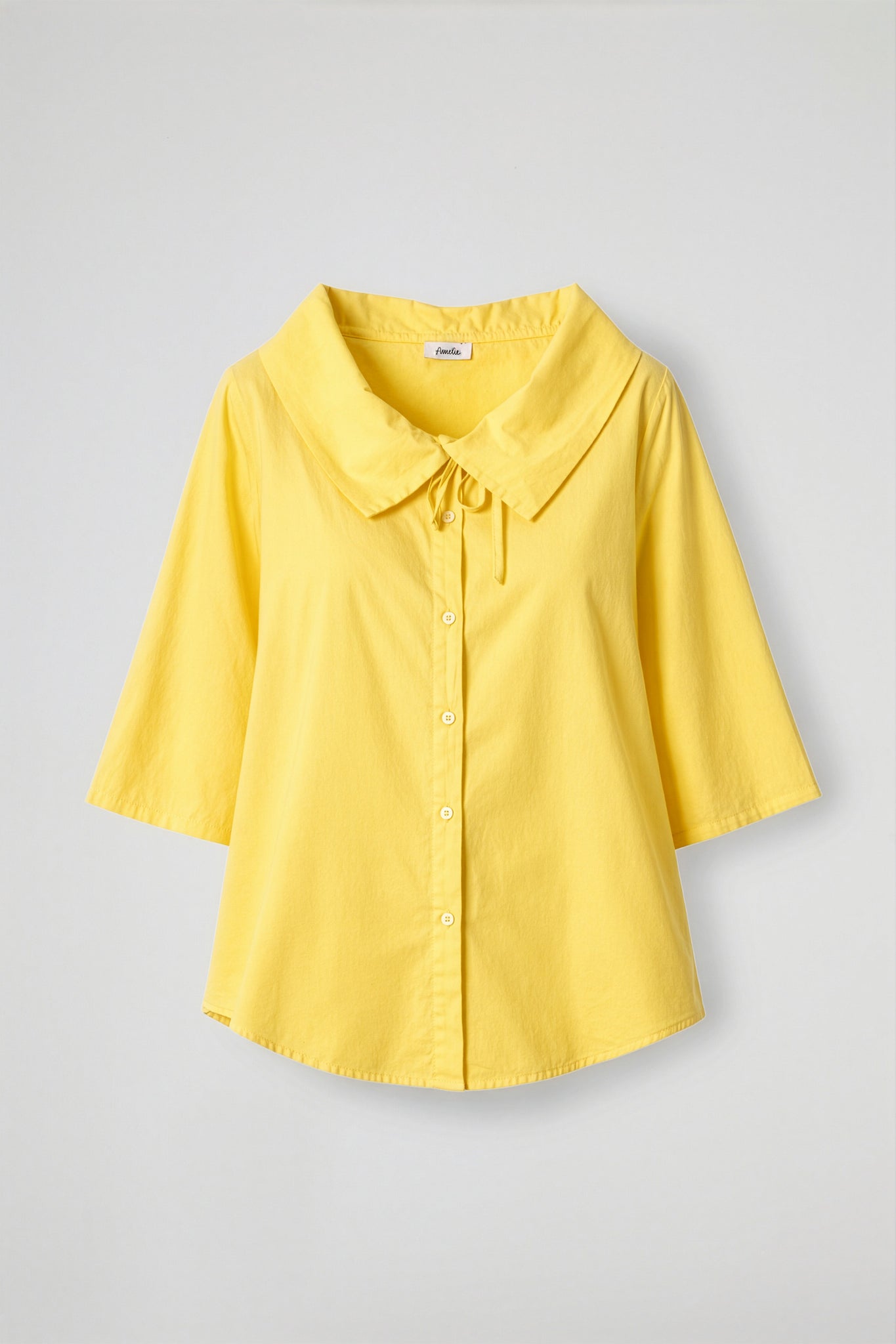 Camicia over, colletto ampio arricciato con dettaglio coulisse regolabile, maniche a ¾ dal taglio ampio, chiusura frontale con bottoni in madre perla, fondo a petalo su entrambi i lati. Linea morbida