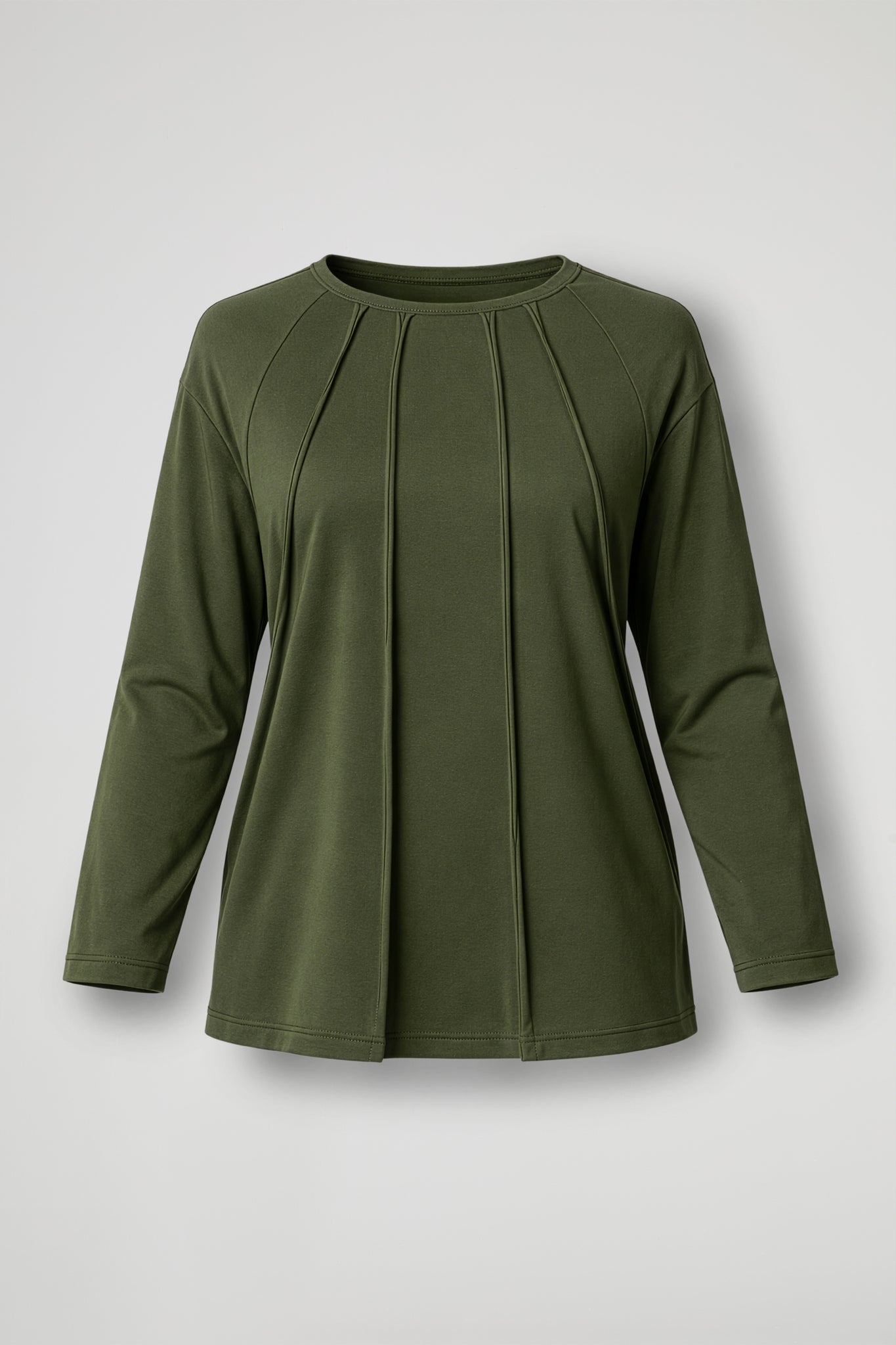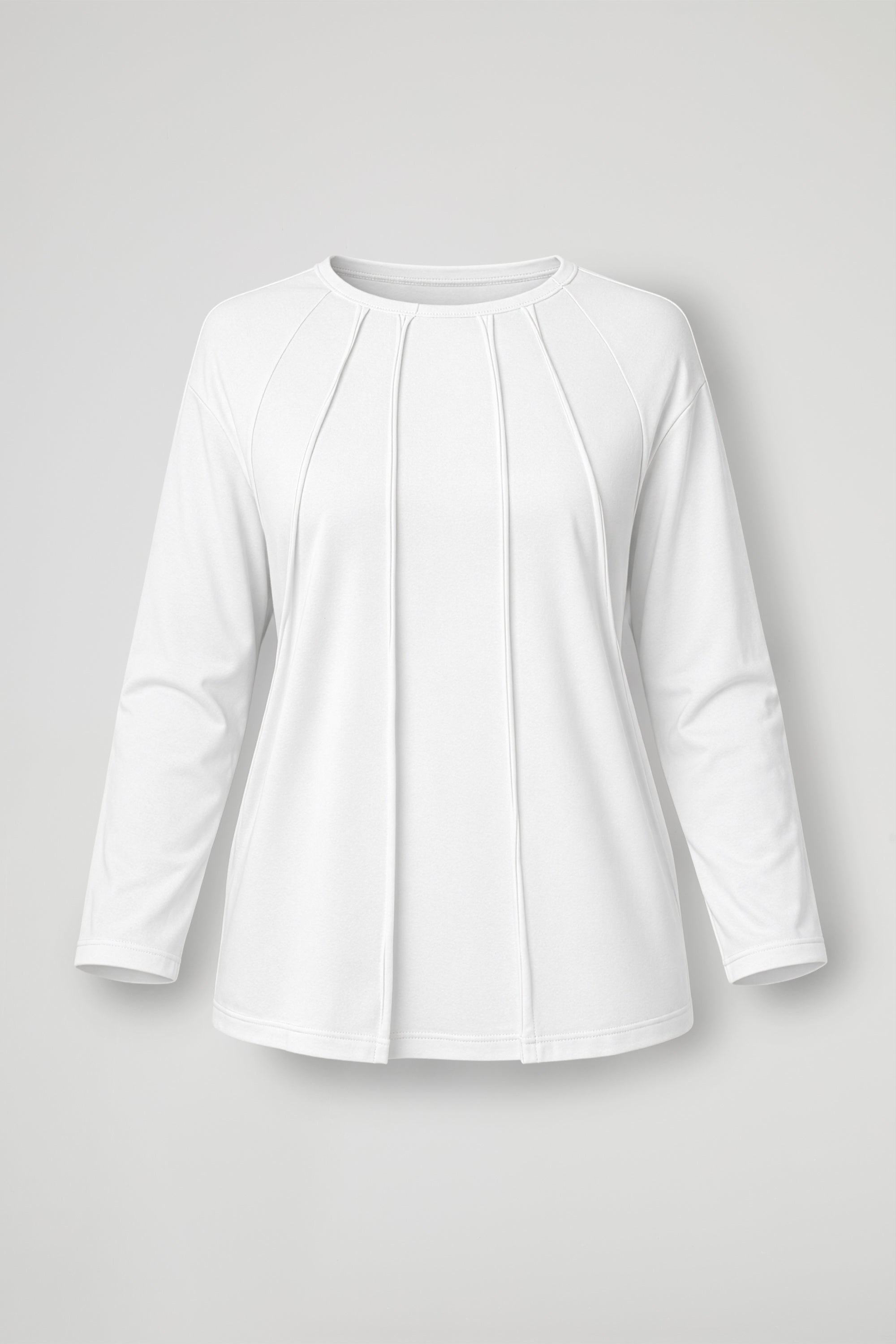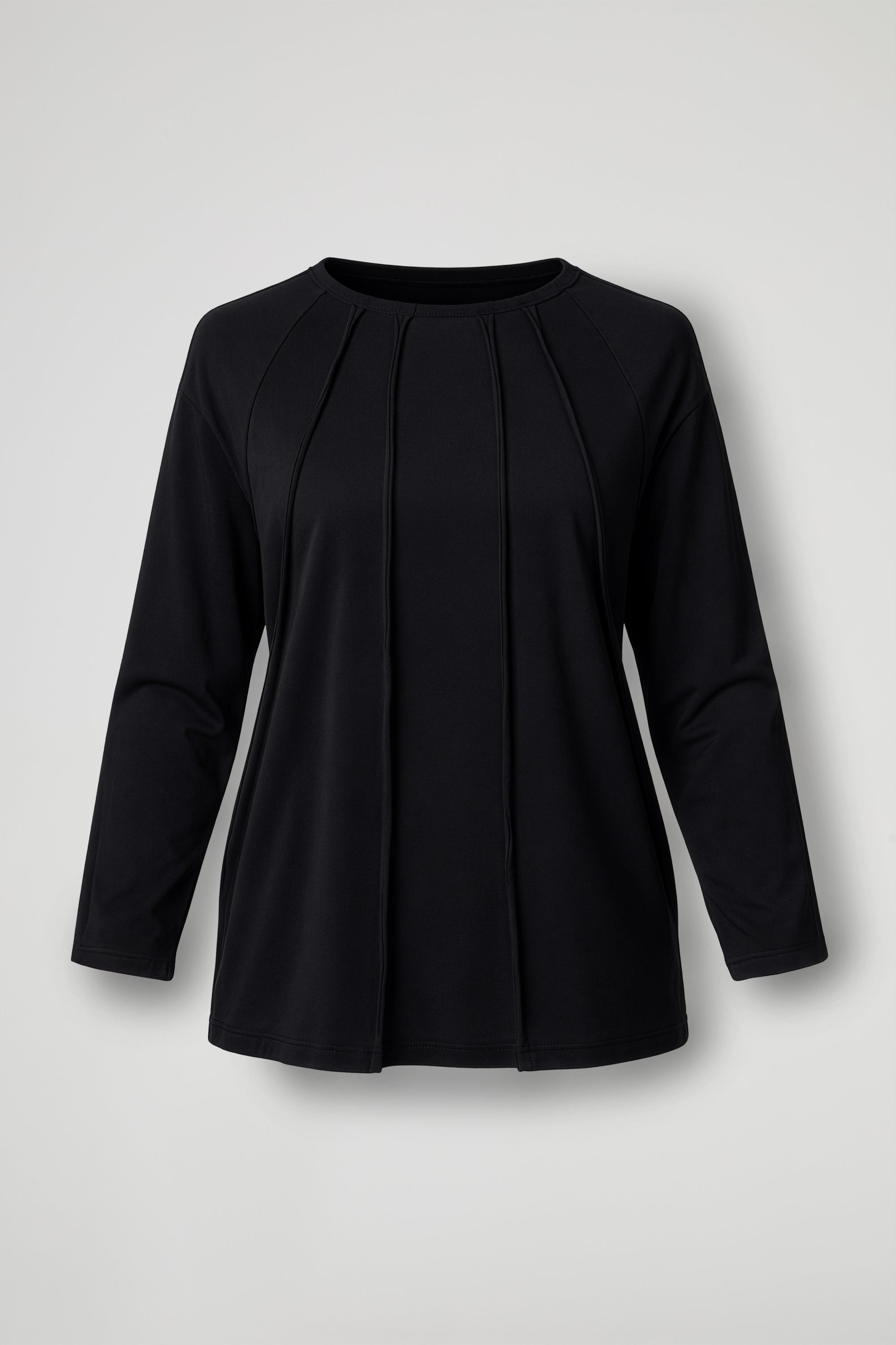 Top in tessuto di cotone, girocollo rifinito con bordino, spalla scesa, manica lunga, impunture verticali a vista sul davanti, fondo leggermente stondato. Lina confortevole.