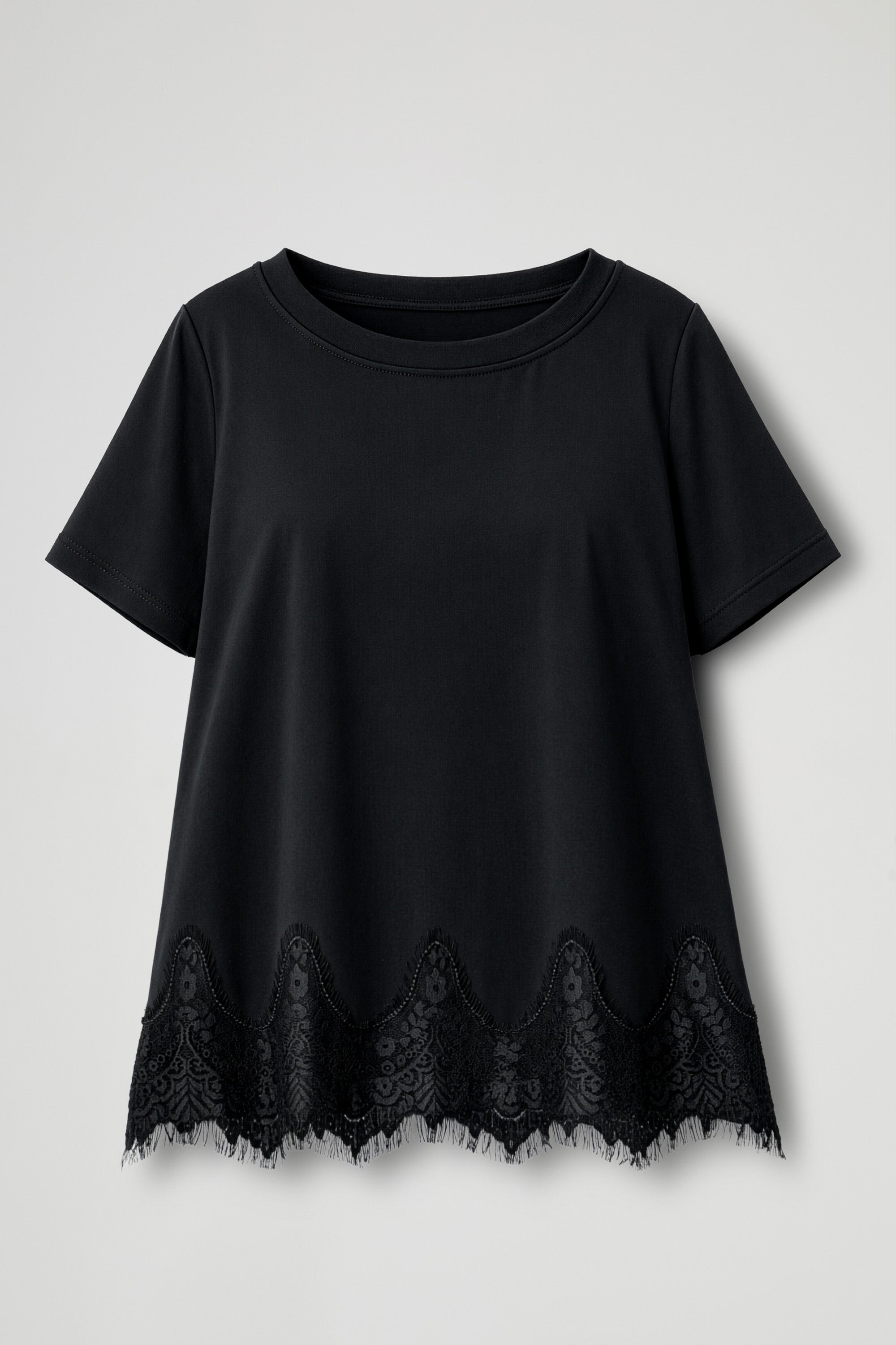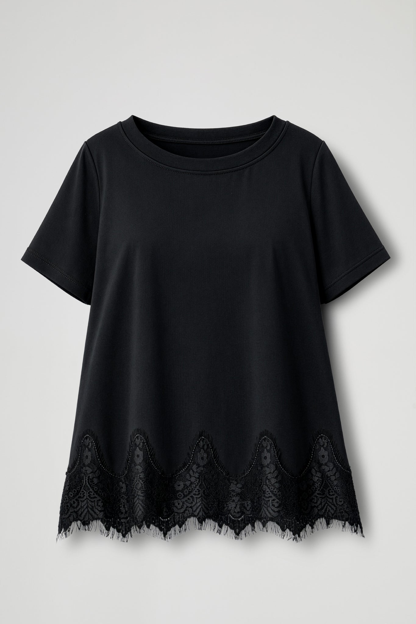 T-shirt in tessuto jersey ,collo con finitura a costina e cuciture tono su tono, manica corta, fondo rifinito con inserto in pizzo nero.