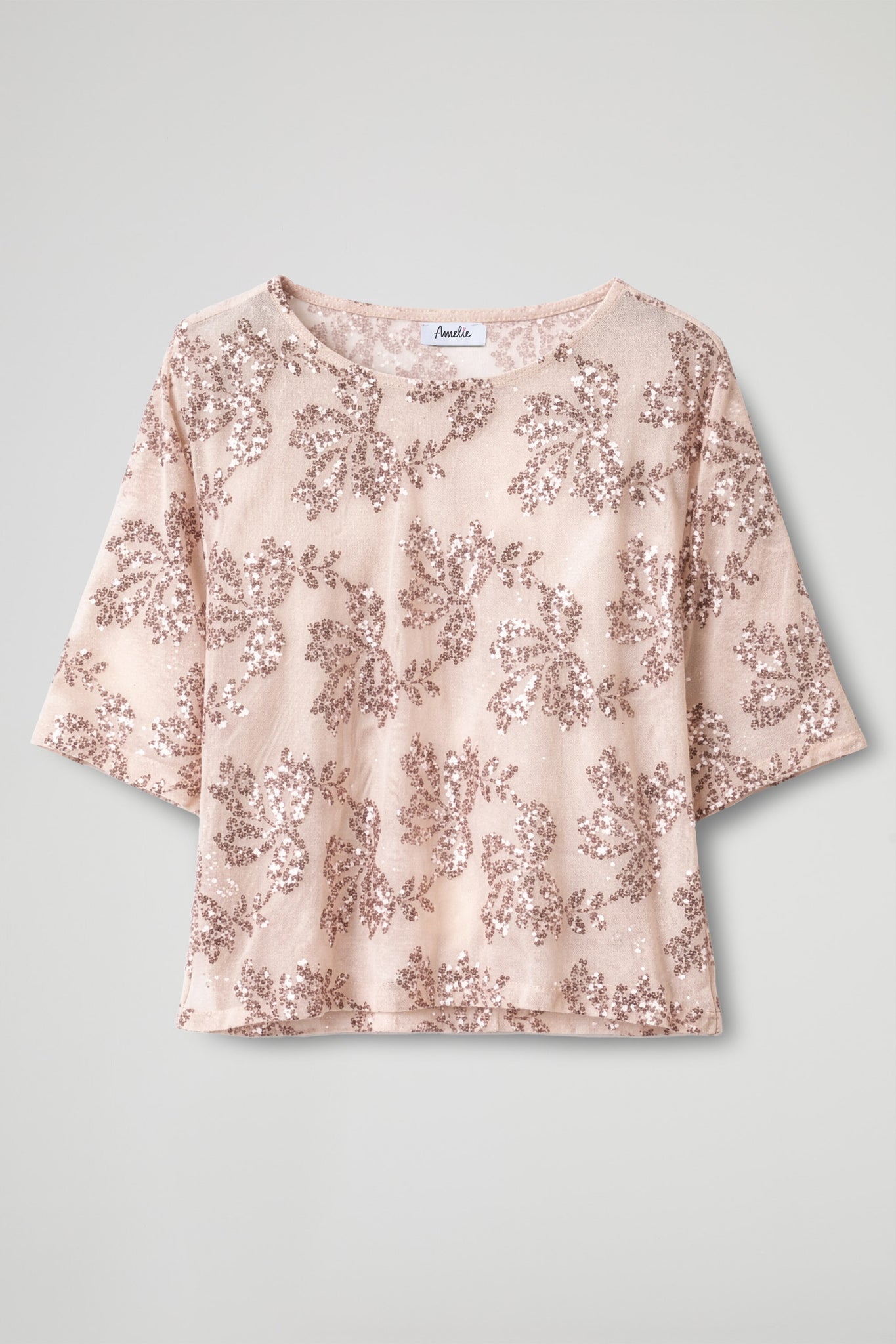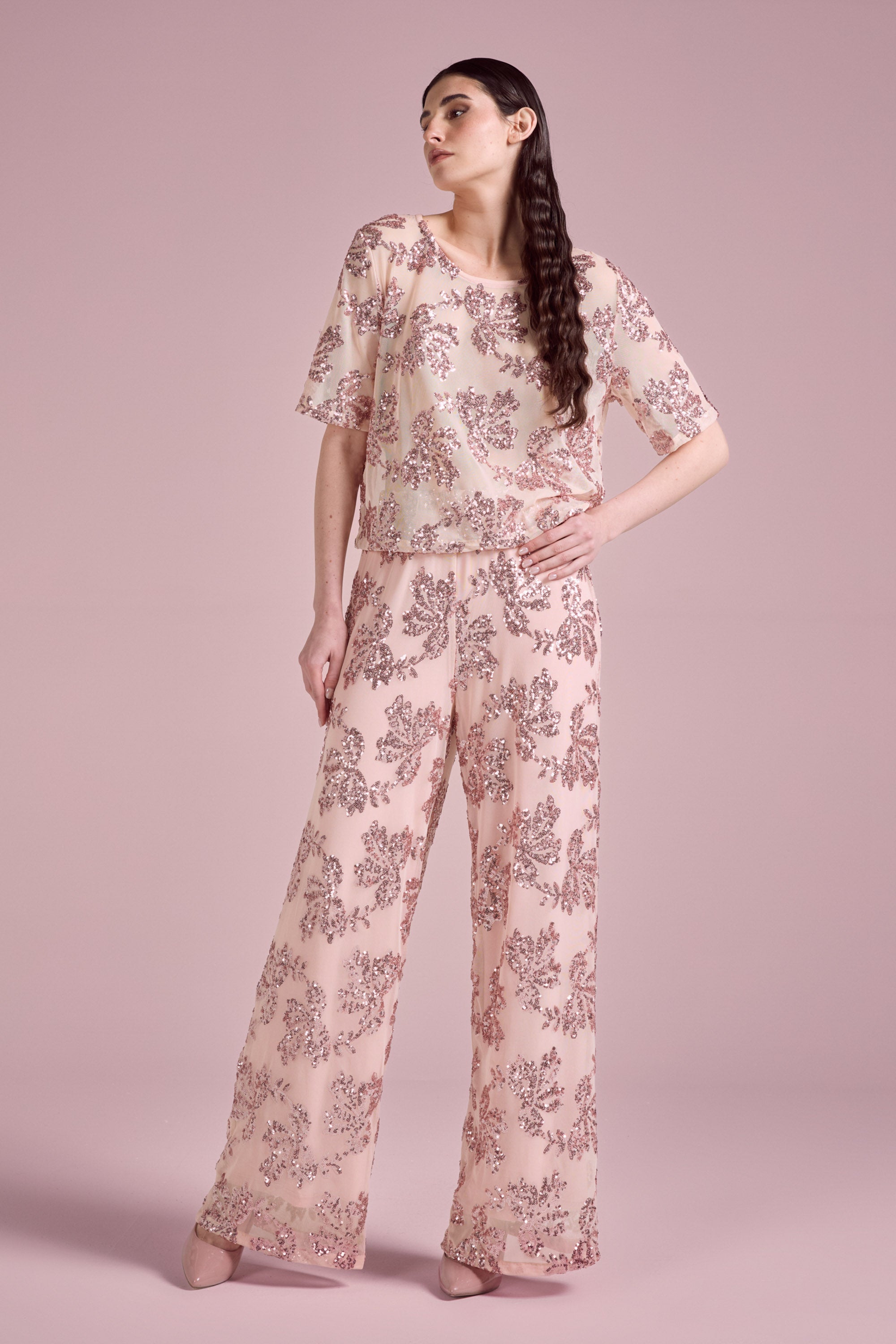 Top elegante dal design luminoso e raffinato, realizzato in tessuto leggero impreziosito da ricami in paillettes con motivo floreale all-over; Il modello presenta una linea morbida e leggermente boxy, con maniche corte e girocollo, per una vestibilità confortevole e contemporanea. La lavorazione ricercata dona brillantezza e rende il capo ideale per occasioni speciali o per creare outfit sofisticati .